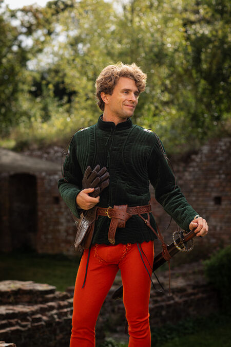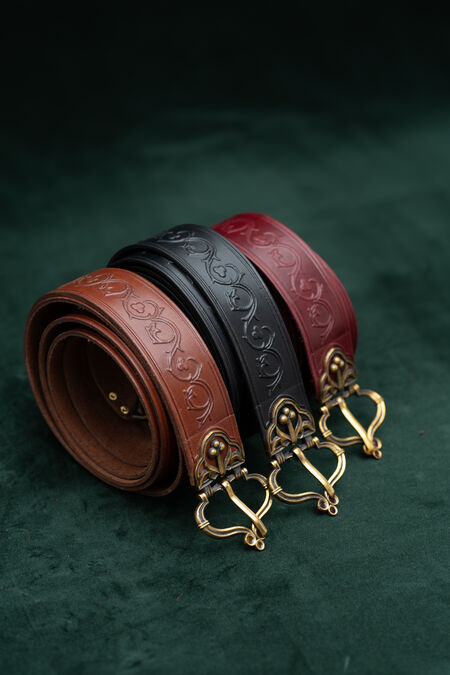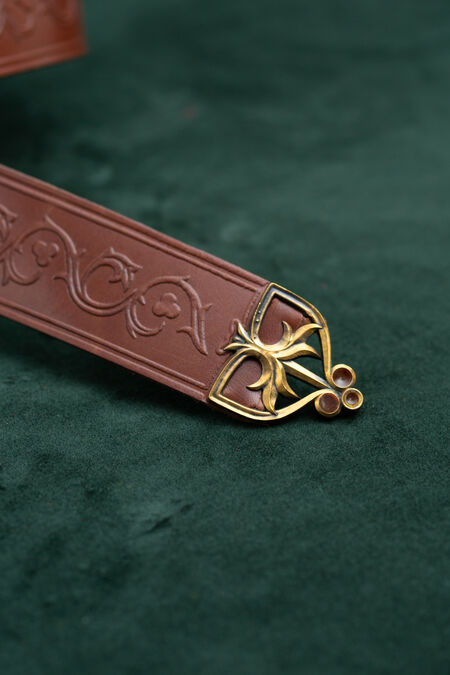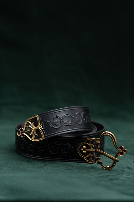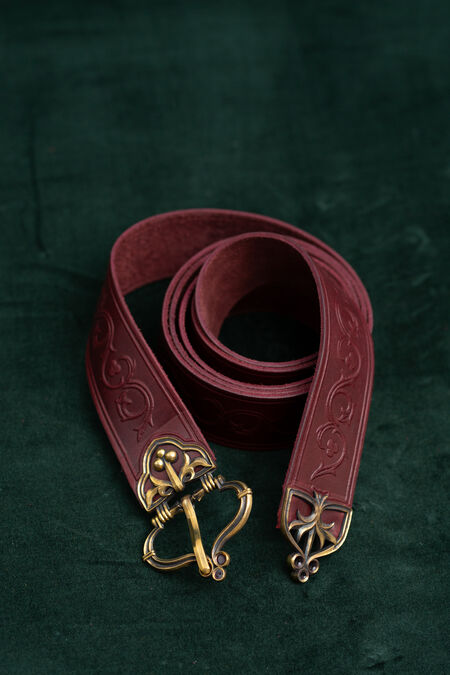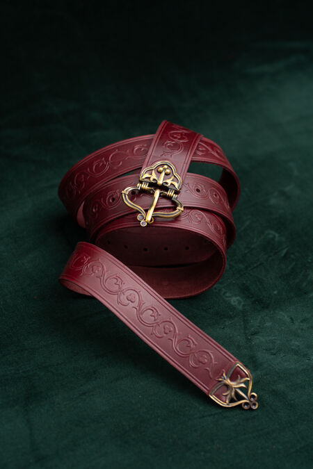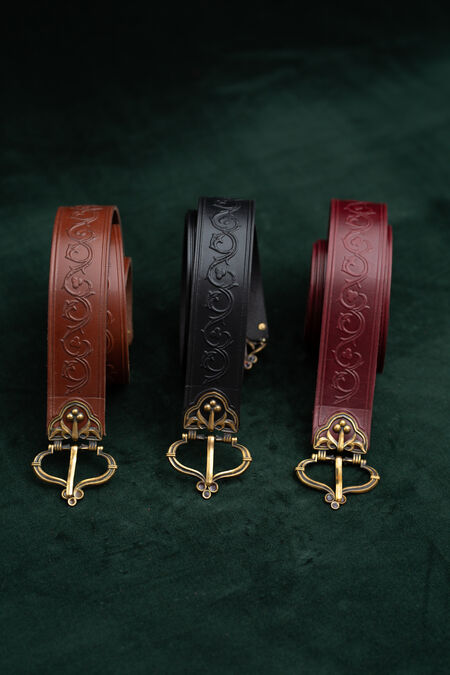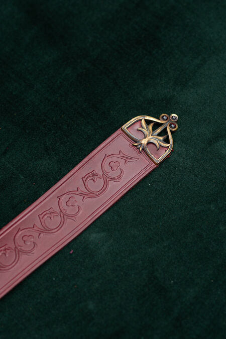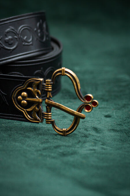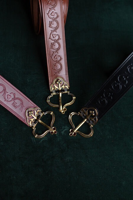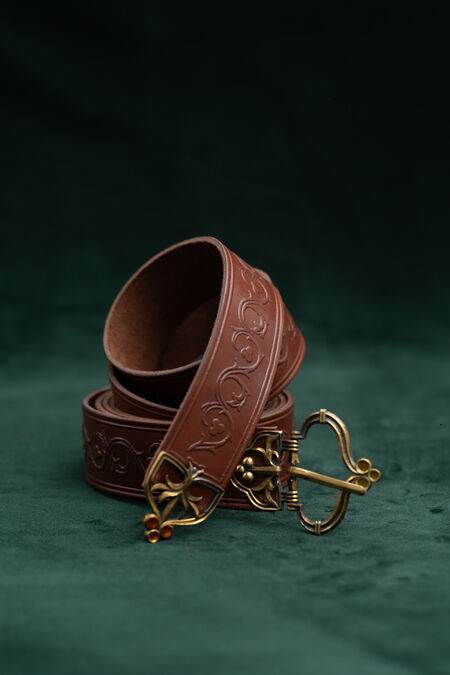 Hochwertiges Naturleder ist mit floralen Prägungen verziert, die von historischen Vorlagen inspiriert sind. Der Gürtel ist in verschiedenen Farben erhältlich, passend zu Ihren Hausfarben, anderen Accessoires oder einfach, um Ihnen genau den schönen Grünton zu verleihen, nach dem Sie schon lange gesucht haben. Schnalle und Endstück wurden speziell für diesen Gürtel entworfen, und jedes einzelne Element ist perfekt aufeinander abgestimmt und trägt zum Gesamtbild bei. Die beiden Messingguss-Elemente des mittelalterlichen Gürtels sind mit Emaille-Akzenten versehen – im Licht betrachtet, sind sie transparent. Unter bestimmten Lichtverhältnissen und aus bestimmten Winkeln leuchten diese winzigen Details in verschiedenen Farben und verleihen Ihrem ohnehin schon beeindruckenden Erscheinungsbild noch mehr Magie. Dieser Rittergürtel ist etwas breiter und hat eine feste Länge.