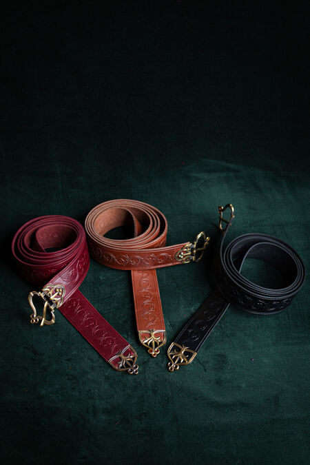 Ursprünglich passend zu unserer neuen Kollektion „Bär“ hochwertiger Lederaccessoires entworfen, kann dieser Gürtel auch allein getragen werden, unabhängig von Ihrem Lieblingstier. Die Prägung des Gürtels selbst sowie die Form der Messinggussschnalle und des Gürtelendes sind mit floralen Ornamenten verziert, die wir in unserem charakteristischen „Sieht sehr organisch und mittelalterlich aus, aber ich kann mich nicht erinnern, das schon einmal gesehen zu haben“-Stil entworfen haben. Der Gürtel zeugt von Würde, Adel und gutem Geschmack des Trägers, besonders in Kombination mit einer der passenden Taschen. Es ist immer wieder faszinierend zu sehen, wie ein so kleines Detail Ihres Kostüms die ganze Legende einer Figur – vom Knappen zum erfahrenen Krieger oder vom Händler zum Vorstandsmitglied – mit einem einzigen, wunderschön verarbeiteten Stück Leder um die Taille verwandeln kann. Egal, ob Sie gerade erst anfangen und der Gürtel Ihr erstes mittelalterliches Kostümelement darstellt oder ob er Ihrer bereits herausragenden Garderobe den letzten Schliff verleiht – jede einzelne Prägung und jede Rippe auf dem Gussteil unterstreicht Ihren individuellen Look.