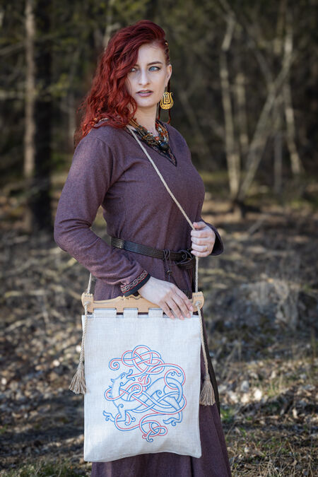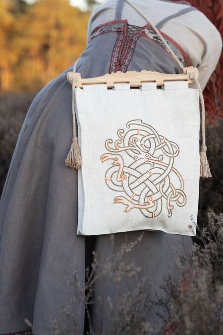 Wir haben diese neue Linie von Wikinger-Accessoires mit einem Rahmen aus massivem Eschenholz auf den Markt gebracht, der nur mit Öl behandelt wurde, um ihn vor Witterungseinflüssen zu schützen und Haltbarkeit zu gewährleisten. Die Wikinger verwendeten jedoch aufwendige Holzbearbeitungstechniken, um den Rahmen mit Schnitzereien zu verzieren. Im Gegensatz zu Kiefernholz pfropft Esche nicht und kratzt nicht auf Ihrer Haut. Die Außenschicht der Tasche besteht aus strapazierfähigem Leinen, verziert mit handgefertigten Stickereien mit Wolfs- oder Wasserdrachenmustern, passend zu Ihren vorhandenen Wikinger-Outfits von ArmStreet. Die Riemen am oberen Rand der Hedeby-Tasche sind um die Löcher in einem „Stuhlrücken“-Griff geschlungen und mit Handnähten verziert. Sie können den Hanfseilgriff mit einfachen Knoten ganz einfach an Ihre Körpergröße und Vorlieben anpassen. Sobald Sie die Tasche anziehen, verschließt der Seilgriff die Taschenöffnung fest, indem er zwei Teile des Holzrahmens zusammenzieht, um alle Ihre Wertsachen sicher aufzubewahren, egal wie aktiv Ihr mittelalterlicher Alltag ist. Ein Vollfutter in natürlicher Farbe bietet Ihren Sachen zusätzlichen Schutz.