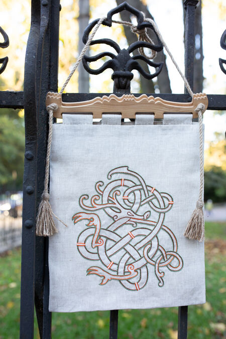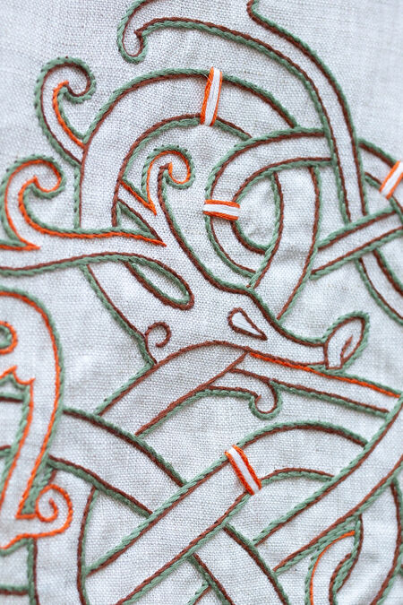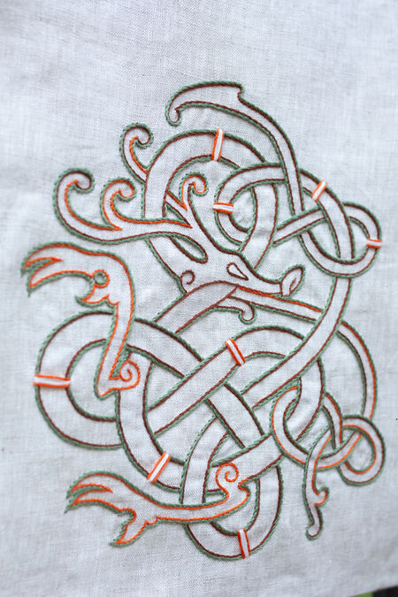 - Handgefertigte Stickereien mit Wolfs- oder Drachenmotiven aus Baumwoll-Mouline-Garn, passend zu den Outfits Ihrer Kollektion „Wikinger“;