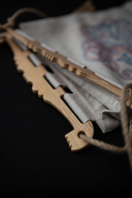 Die funktionale Tasche basiert auf archäologischen Funden aus der Wikingersiedlung Haithabu (Hedeby), einem wichtigen Handelszentrum im 8.-11. Jhdt nahe der Ostsee im heutigen Norddeutschland. Haithabu lag an wichtigen Handelsrouten, die Skandinavien mit Europa und darüber hinaus verbanden, und war ein blühendes Zentrum für Handel und Kultur. Die Tasche bestand typischerweise aus einem Paar Holzrahmen, oft aus Eiche oder Esche, an denen ein Stoffbeutel (und möglicherweise Lederbeutel) sicher befestigt war. Die Kombination aus Holzplatten und einem durchgezogenen Seilgriff verhindert, dass der Inhalt der Tasche herausfällt – ein Muss für den täglichen Gebrauch der Händler, Handwerker und Siedler von Haithabu. Das Design schien so erfolgreich, dass die Bilder in Ibn Butláns „Tacuinum Sanitatis“ noch im Mittelalter Taschen im gleichen Stil zeigen.