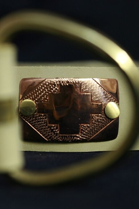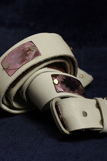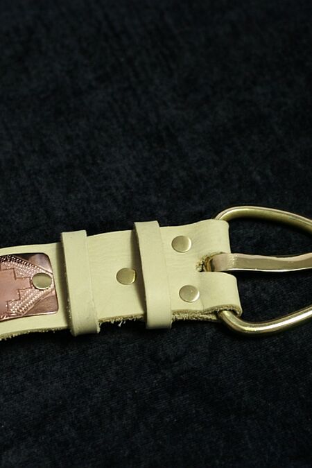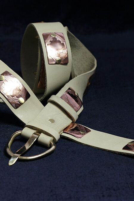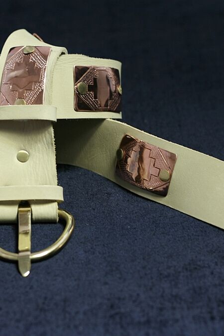 Mittelalter Gürtel, aus milchweißem, weichem, aber festem Leder bester Qualität gefertigt. Der Gürtel, sowie die Messinghaken und Kupferornamente sind ausschließlich handgefertigt.