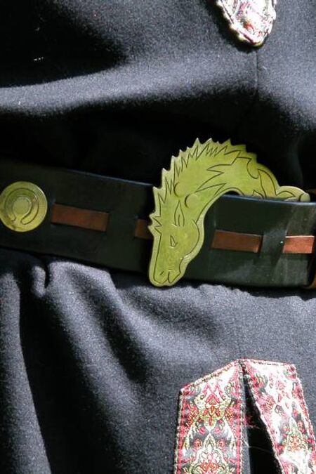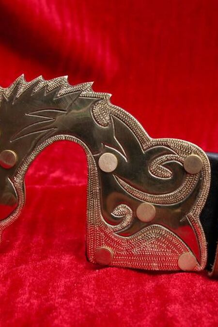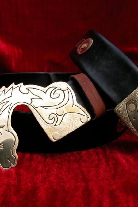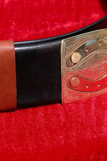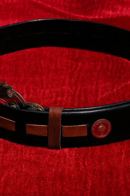 Handgefertigter, schwerer mittelalter LARP Gürtel mit handgeschmiedeten Messingverzierungen und sehr ungewöhnllichen Schliessen. Wunderbare Ergänzung für jedes mittelalter Gewand oder Kostüme, aber auch als Gürtel für jeden Tag verwendbar. Aus festem, echtem Leder in hervorragender Qualität gefertigt. Mittelalter Gürtel und Messingornamente sind komplett handgefertigt. Maße: Länge - 106,6 cm + 5,08 cm, Breite - 3,8 cm.