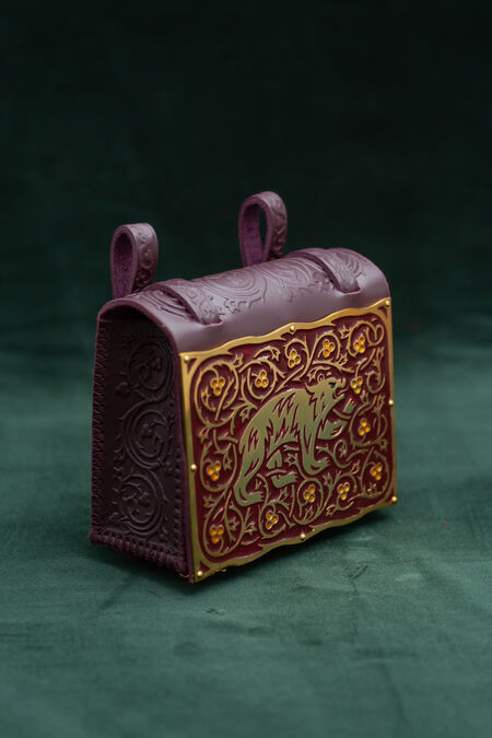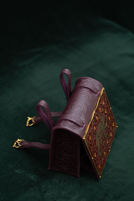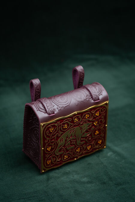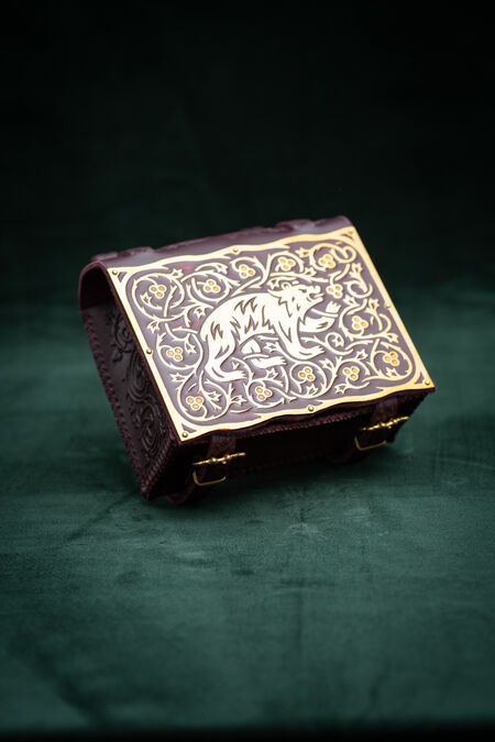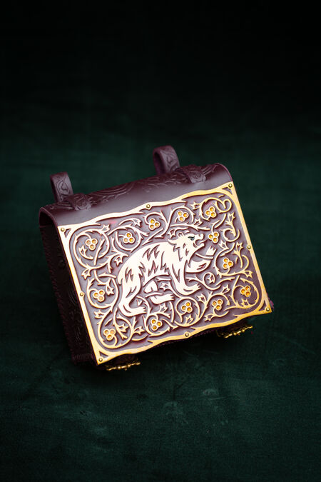 Willkommen, das neue Accessoire! Es bereitet allen, die Bären auf ihrer Kleidung oder anderen Accessoires lieben, Freude und ein „Endlich!“. Hier ist er, der wilde Bär, in Messing geätzt und mit Emaille verziert. Um das Tier herum, sowohl auf dem Messingpaneel als auch auf dem Leder selbst, sind wunderschön florale Muster angeordnet. Diese mittelalterliche Tasche ist deutlich raffinierter und edler als ein gewöhnlicher Beutel und passt perfekt zu einer edlen Persönlichkeit oder einem Ritter.