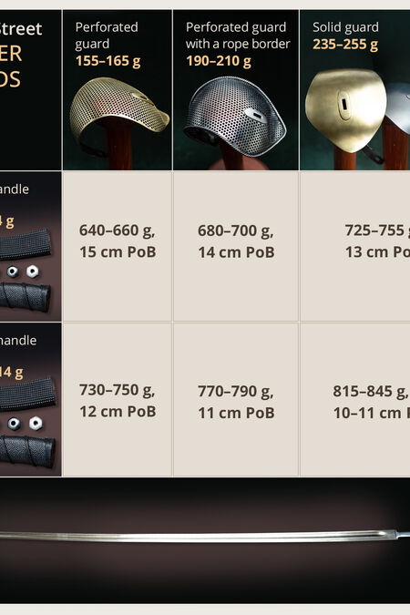 - Schwerer Griff, Handschutz ohne Kante: 730–750 g, Schwerpunkt: 12 cm;