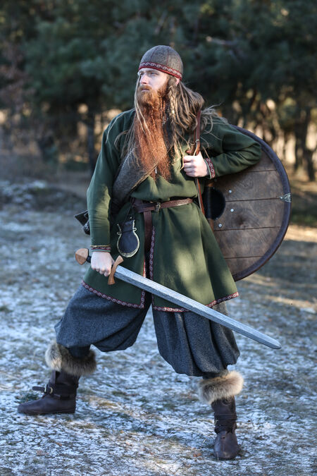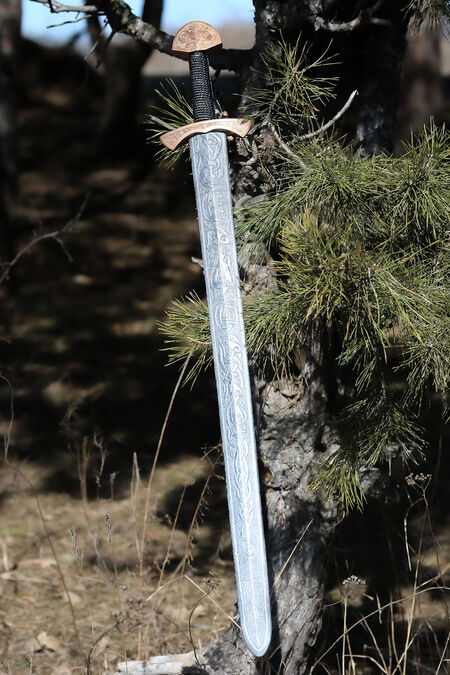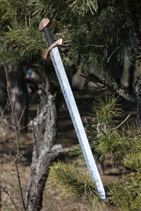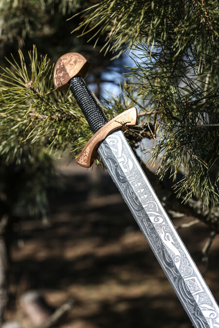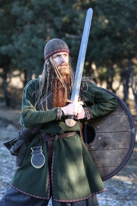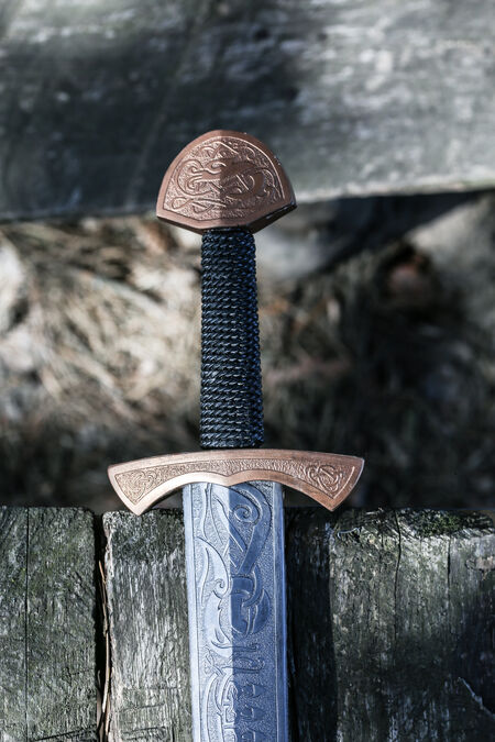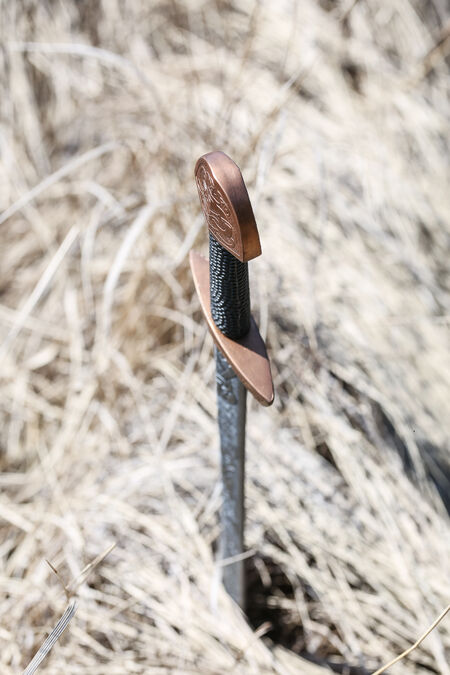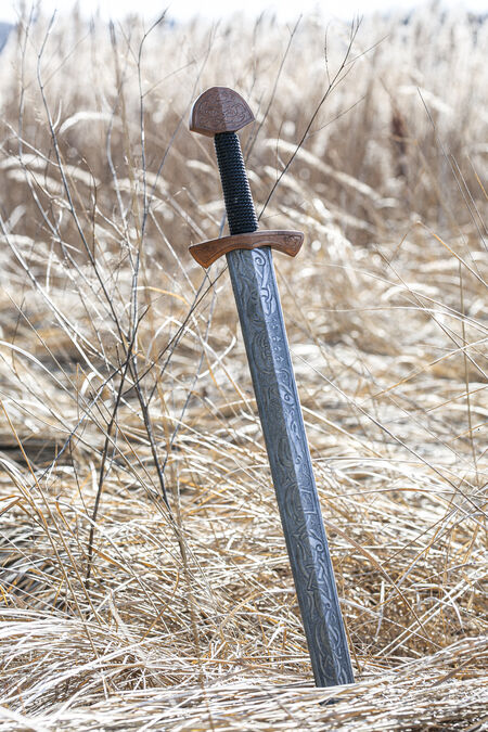 Die Form dieses Schwertes ist traditionell Wikingerzeit. Es soll in einer Hand verwendet werden, hat also einen kurzen Griff, der gut in Ihre Handfläche passt, kleine Parierstange und einen schön geformten Knauf. Die Form des Schwertes selbst ist ziemlich gerade und erreicht am Ende einen leicht abgerundeten Punkt. Alle Entwürfe für dieses Schwert wurden von unserem Designerteam im eigenen Haus entworfen und gefertigt, einschließlich der künstlerischen Knotenmuster.