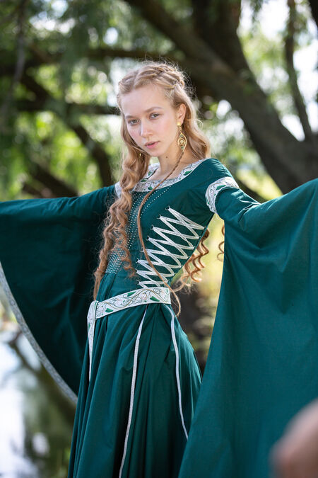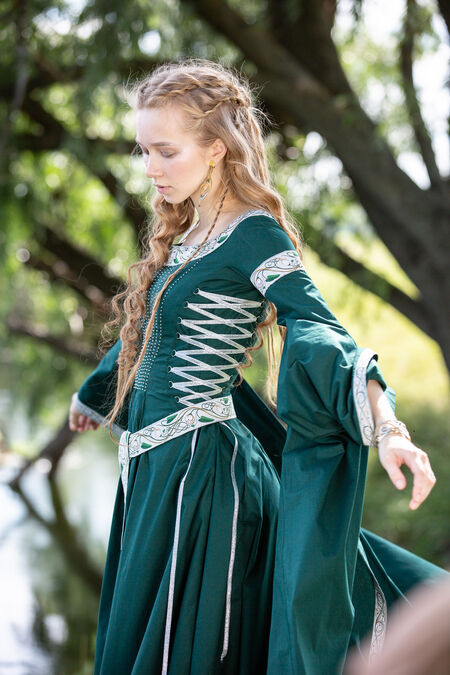 Dieses Kleid ist die perfekte Linie aus Geschichte und Fantasie, verwendet die besten Teile mittelalterlicher Kleidung und kombiniert sie mit einem Gefühl des Staunens. Dieses Kleid sieht aus, als wäre es aus einer Artuslegende hervorgegangen und für eine Königin, Priesterin, Magierin, Adlige oder Göttin geeignet. Ein kunstvoll plissiertes Oberteil hat einen weiten Ausschnitt, der zu Ärmeln führt, die an der Schulter sitzen, aber lang sind und unten fließen. Durch die seitliche Schnürung am Oberteil erhalten Sie die perfekte Passform für Ihren Oberkörper, und der Rock fließt mit zusätzlichen Gores für mehr Volumen zum Boden.
