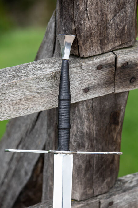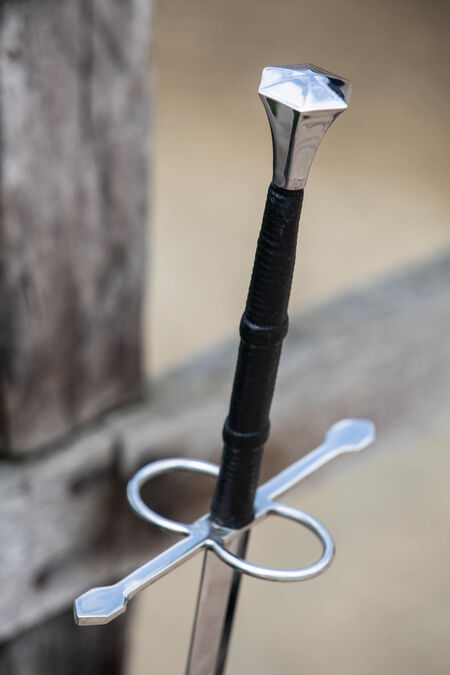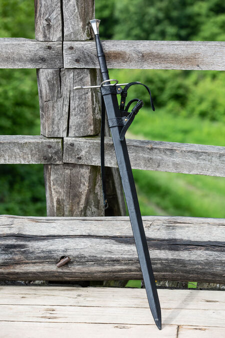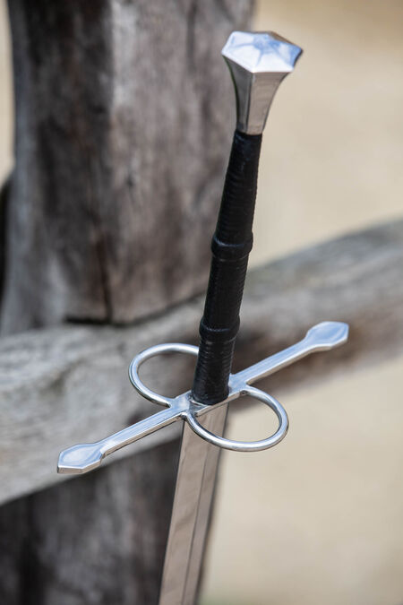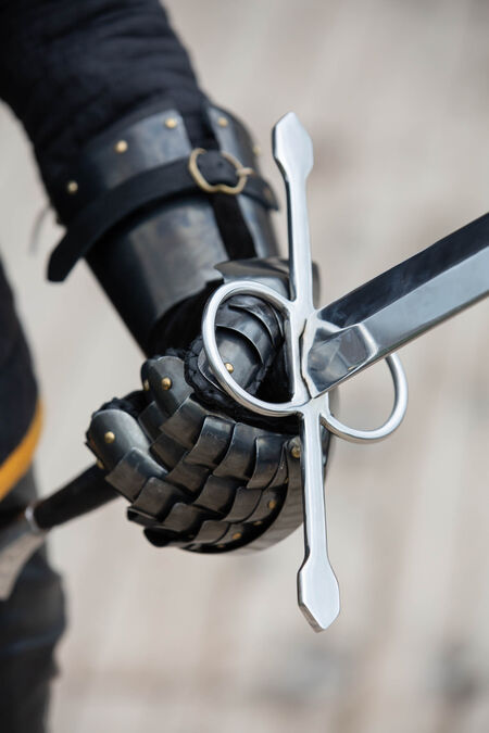 Dieses Schwert ist historisch inspiriert und nimmt schwere Design-Warteschlangen aus dem 15. Jhdt auf. Es gibt Aspekte dieses Schwertes, die es zu einem Markenzeichen des europäischen Schwertes aus dem späten 15. Jhdt machen, wie die geraden Stacheln und Ringe um die Parierstange. Dieses Schwert ist schlicht und edel und erinnert mit seinen klaren Linien und seiner feinen Handwerkskunst an Schönheit, die sich von Radierungen und anderen Zierelementen unterscheidet.