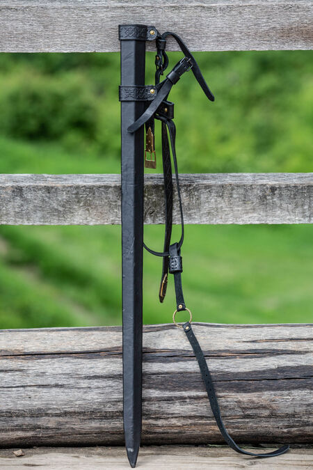 Die Scheide ist dem Schwert sehr ähnlich - sie ist schlicht und minimalistisch, aber aus hochwertigen Materialien gefertigt. Ein Edelstahlkern sorgt dafür, dass er perfekt zum Schwert passt - Sie werden sehr zufrieden sein mit dem Klang, das beim Ein- und Aussteigen in die Scheide zu hören ist! Die Außenseite der Scheide besteht aus geschmeidigem schwarzem Leder.