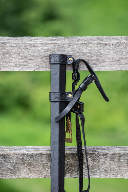 Die Scheide hat zwei Aufhängepunkte, die mit einem geometrischen Muster geprägt sind, das zum Rest des Sets passt. Diese sind mit Gurten verbunden, die angepasst werden können, um sicherzustellen, dass Sie die bequemste Position einnehmen.