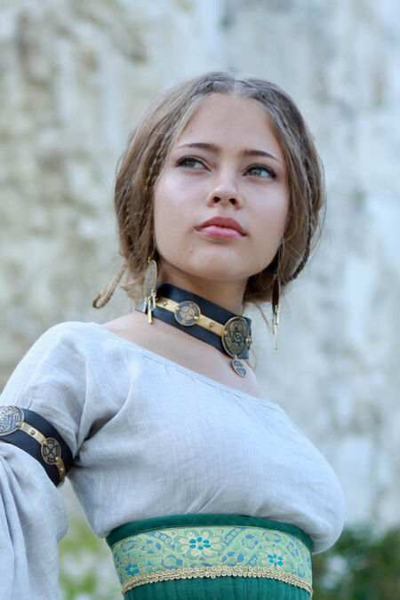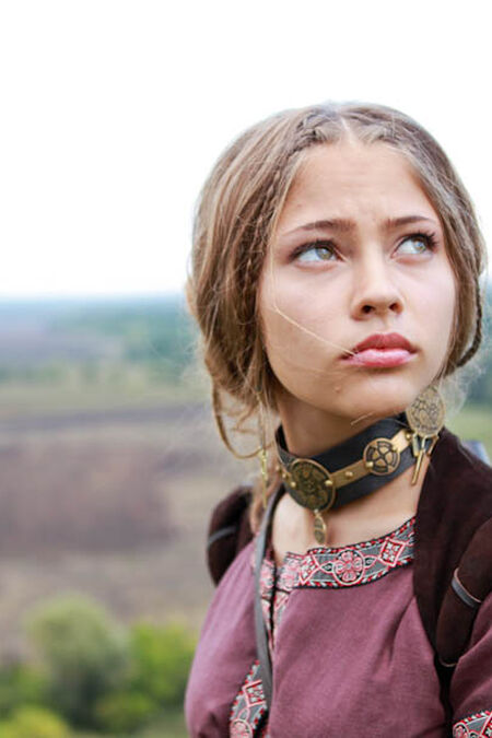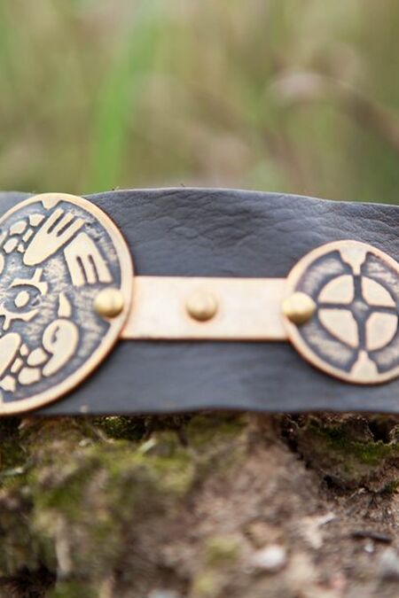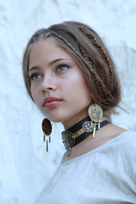 Diese Halskette ist Teil unserer Kollektion „Bogenschützin“. Messing-Akzente und Nieten, handgefertigte Ätzung im keltischen Stil, echtes Leder. Die Halskette ist aufgrund der Weichheit des Metalls leicht verstellbar. Kann leicht zum Einstellen in einem Bereich von ~ 5cm gebogen werden.