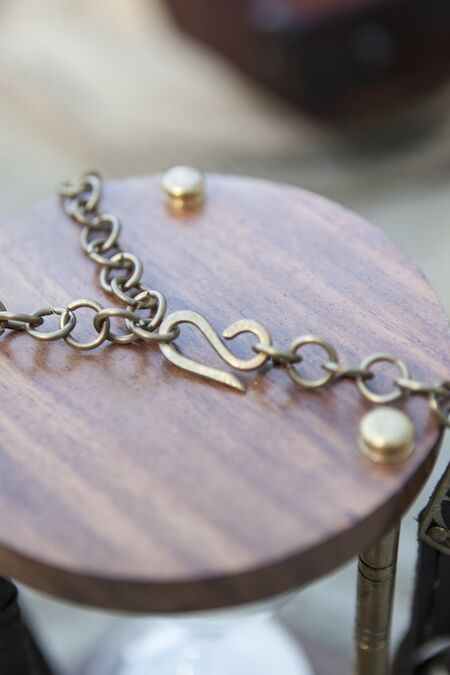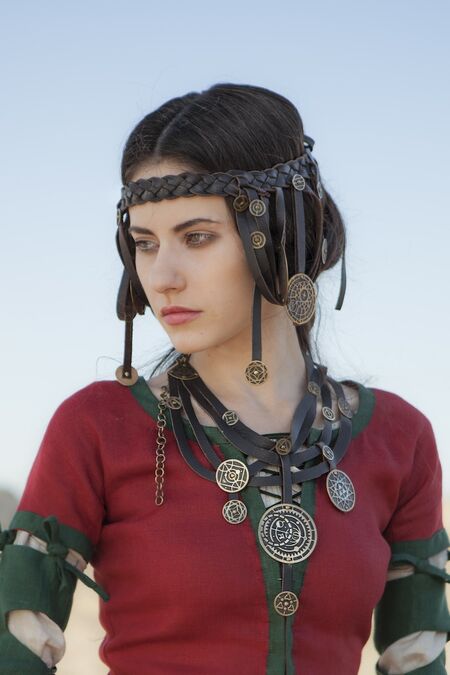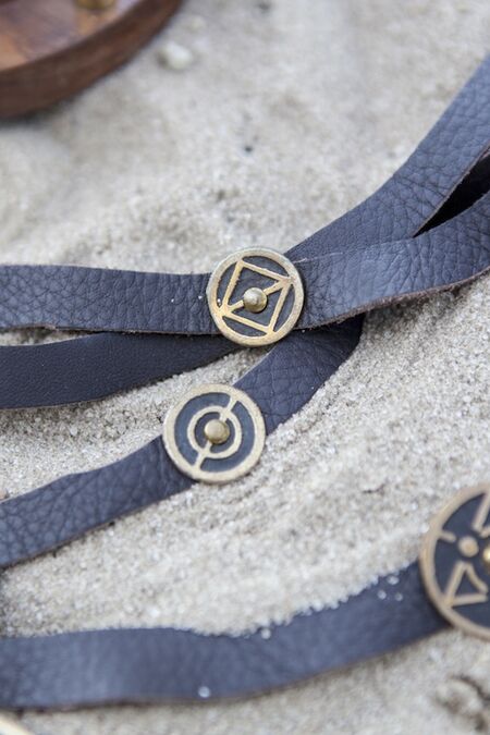Diese einzigartige Juwelierarbeit wurde speziell für unser Kostüm und Accessoire-Set „Tochter des Alchimisten“ entworfen. Die elegante „Zufälligkeit“ und der natürliche Look sind die Ergebnisse harter Arbeit und der kreativen Visionen unserer Designer und Handwerker. Die Bänder aus echtem Leder sind mit Messingornamenten (wahlweise rostfreiem Stahl) geschmückt. Jedes einzelne Ornament ist von Hand gefertigt und mit Ätzmustern verziert.