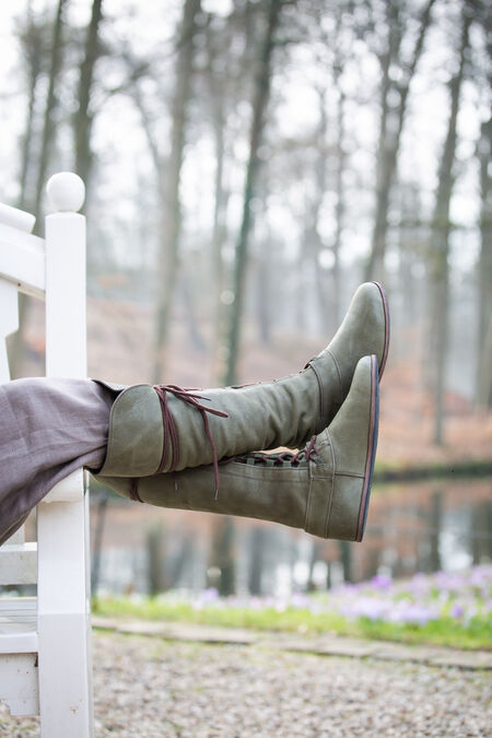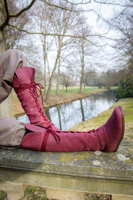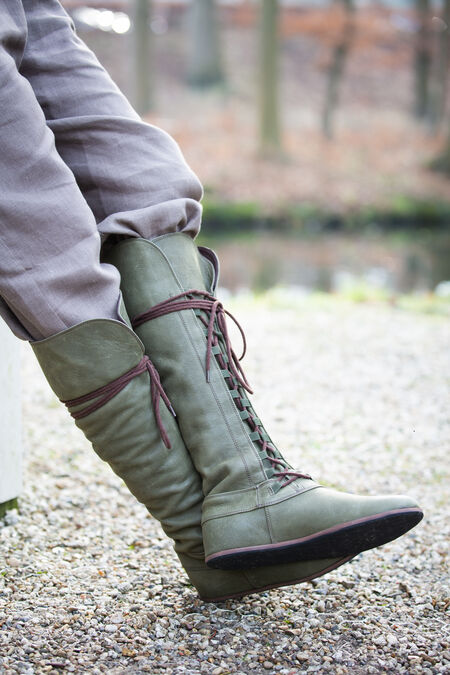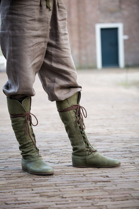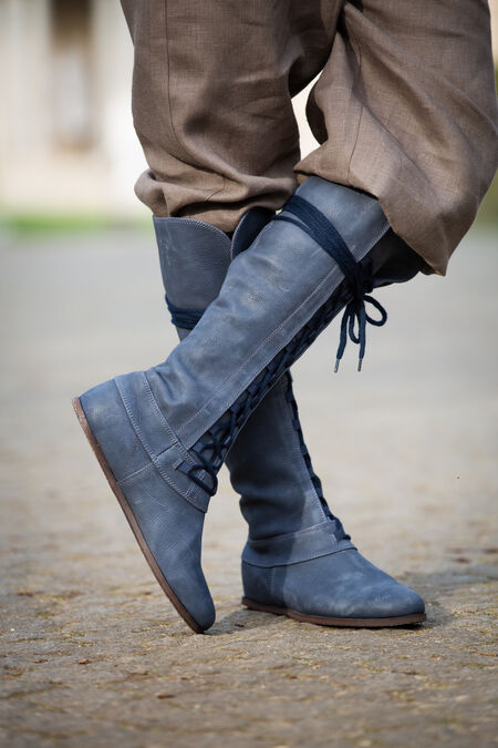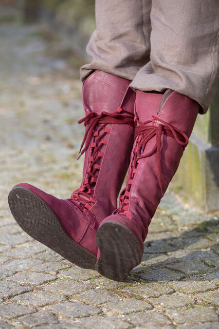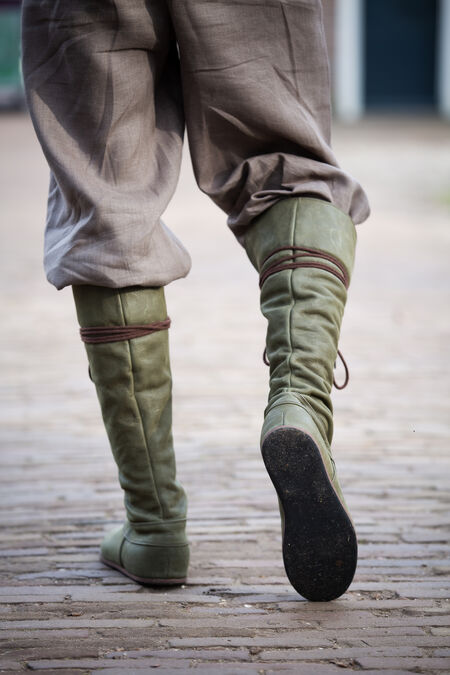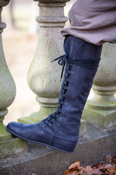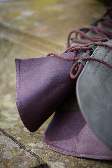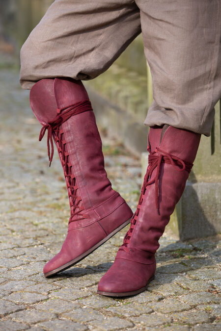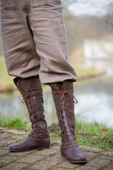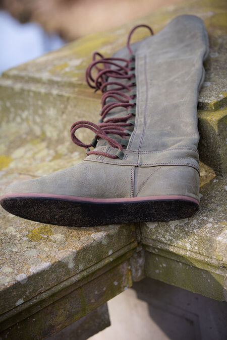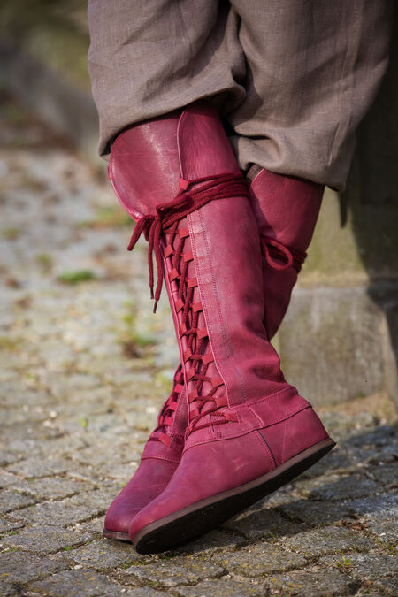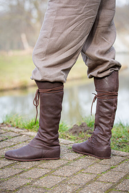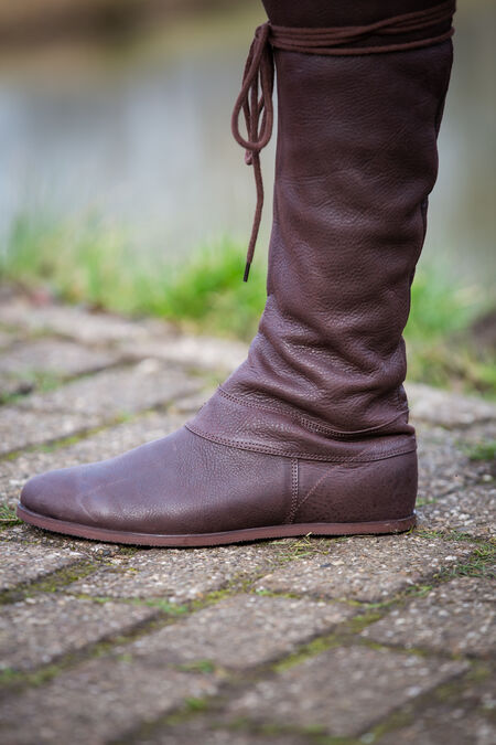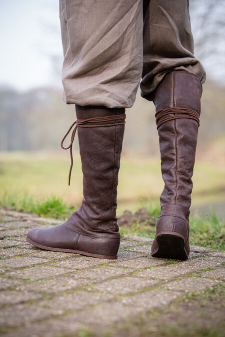 Die Stiefel sind aus echtem Schweineleder gefertigt - ein sehr robustes doch auch extrem weiches und anschmiegsames Material, das wie ein Handschuh am Bein sitzt. Die Stiefelsohle besteht aus Gummi, die Sohlenkanten sind jedoch nach historischen Fertigungstechniken bearbeitet. Aus diesem Grund fällt die Verwendung moderner Materialen nicht sofort ins Auge und beeinträchtigt den authentischen, historischen Look in keiner Weise. Mittelalterlicher Look gepaart mit modernem Komfort machen dieses Modell zu einem absoluten Bestseller.
