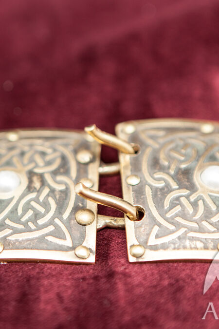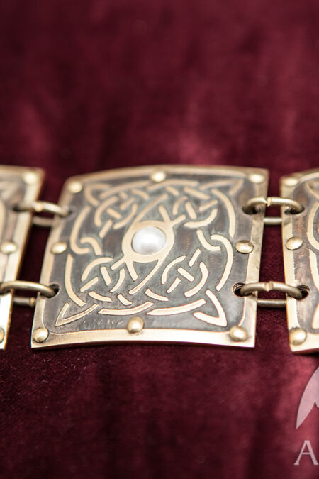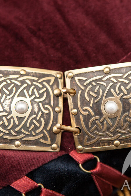 In diesem Set versuchten wir, den Schnitt und Stil des Kleides der Guineveres von Edmund Leightons Gemälde "Der Ritterschlag" oder "Die Akkolade" genau zu replizieren, und dieser Gürtel ist ein wichtiger Teil des visuellen Bildes. Der Gürtel ist aus Messing anfertigt (Edelstahl ist auch vorhanden) und mit ArmStreets erkennbarer Ätzung und mit Kunstperlen verziert.
