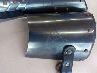 Diese bestehen aus 0,8 mm Federstahl, wodurch sie leicht und flexibel sind. Bestehend aus vielen verschiedenen Lammen, sind dies unsere bisher flexibelsten Stulpen. Sie sollten in der Lage sein, Ihr Schwert zu greifen, Ihre Hände zu beugen und zu kämpfen, ohne Ihre Bewegung zu stark einzuschränken, da sich eine Reihe von Nieten hinten und an der Seite der Handfläche befinden. Der Handschuh streckt sich auch ein wenig über Ihr Handgelenk, um Ihnen ein wenig Unterarmschutz zu bieten. Er lässt sich mit einem Scharnier öffnen und mit einer Schnalle schließen.