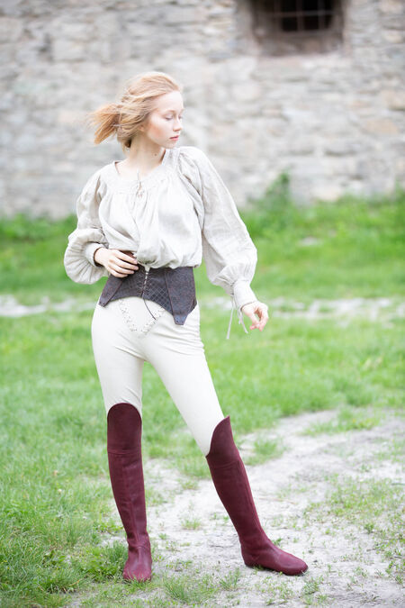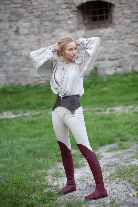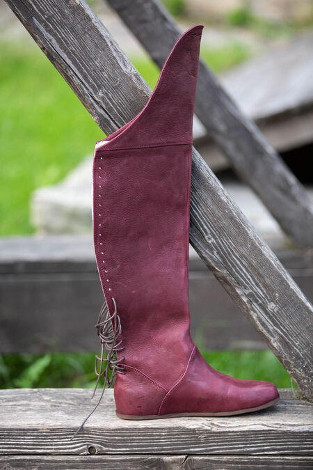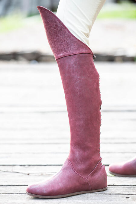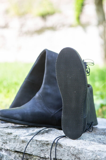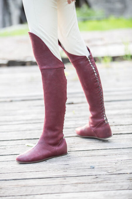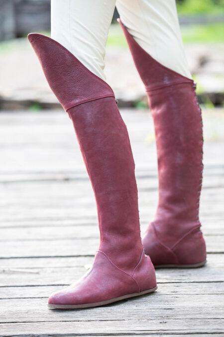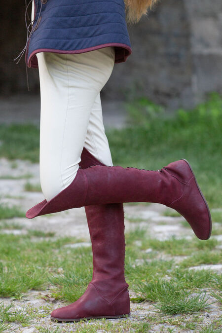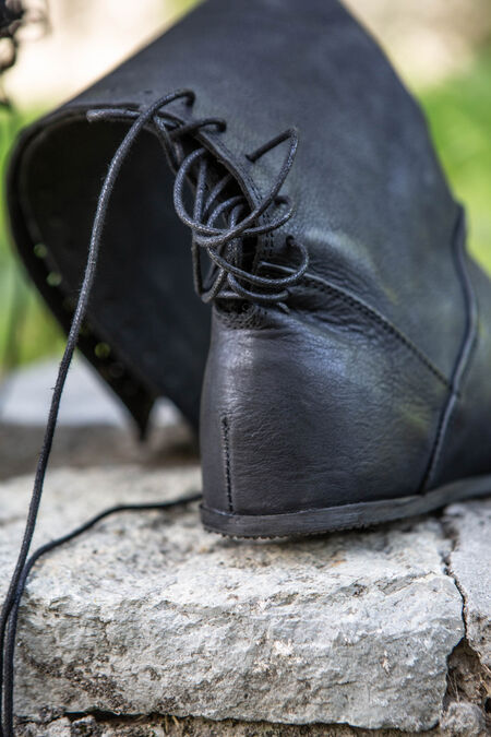 Die Stiefel sind eine hervorragende Ergänzung für jedes Mittelalter- oder Fantasy-Kostüm, da sie generisch genug sind, um für eine Reihe verschiedener Zeiträume und Charaktere geeignet zu sein. Egal in welcher Situation, sie werden Ihnen zweifellos dabei helfen, über Ihre Feinde zu laufen. Die Unterseite des Schuhs besteht aus einem modernen Schuhleisten und einer modernen Sohle, um Ihnen Komfort zu bieten, den es im Mittelalter nicht gegeben hätte! Diese Sohle besteht aus vielen Schichten, einschließlich einer Lederdecksohle, einer Lederfaserplatte, einer orthopädischen Basis und einer Gummi-Außensohle.