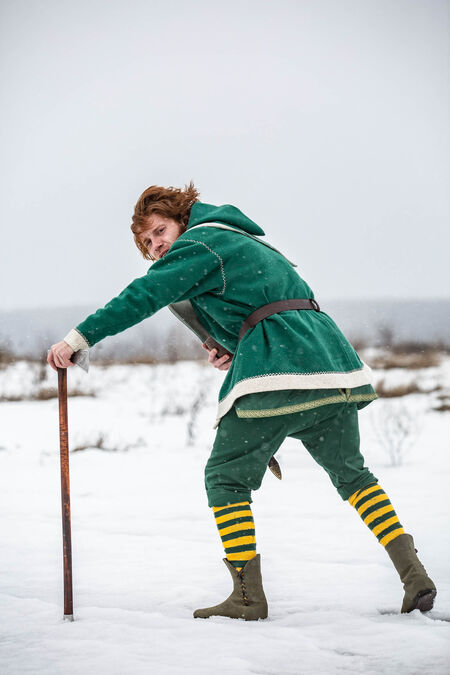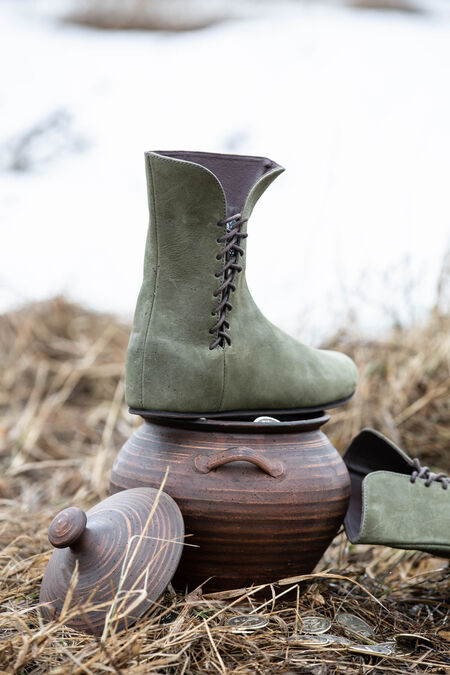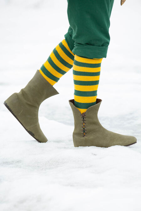 Sie sind aus grünem Leder gemacht, das strapazierfähig und steif und dennoch geschmeidig ist. Sie fangen recht steif an, passen sich aber mit der Abnutzung der Form Ihrer Füße an. Die Innenseite der Schuhe ist mit kontrastierendem braunem Leder gefüttert, was die Lebensdauer der Schuhe im Vergleich zu anderen Materialien erhöht. Das Futter sieht außerdem fantastisch aus und verleiht Ihrem Kostüm ein wenig mehr Farbe und Textur. Die robuste Außensohle der Schuhe ist mit einer aufklebenden Gummischicht verstärkt, die ein Abrutschen verhindert und die Schuhe beim Stehen auf modernen Straßen unterstützt (wer mittelalterliche Ledersohlen getragen hat, weiß, wie rutschig sie sein können!).