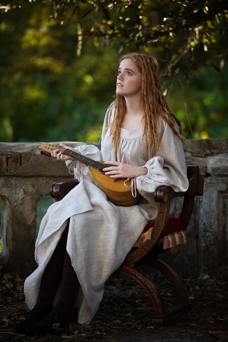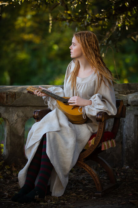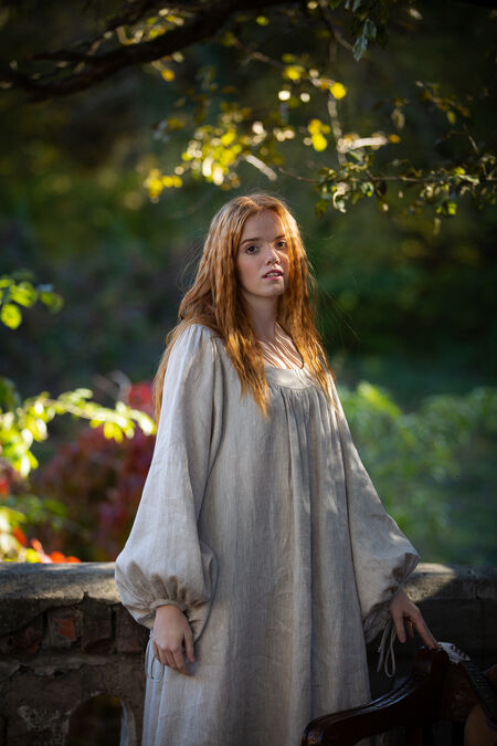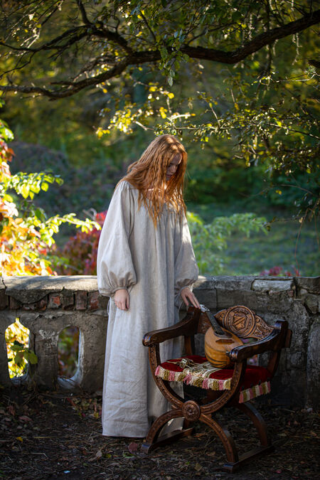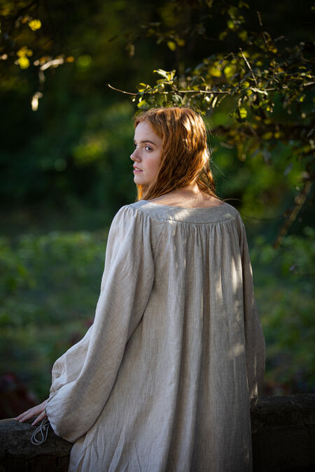 Chemise spielte schon immer eine große Rolle in einer weiblichen Garderobe. Deshalb arbeiten wir an verschiedenen Arten von Unterhemden, damit Sie eine größere Vielfalt genießen können. Diese Tunika ist lang, hat weite Ärmel und einen U-Ausschnitt. Alle Nähte sind gut verarbeitet, da sich unsere Näherinnen sehr gut um jedes Kleidungsstück kümmern. Die Untertunika ist ziemlich voluminös, da sie viel Stoff entlang des Ausschnitts sowie am Handgelenk hat. Dadurch wirkt die Tunika leicht und passt perfekt in eine entspannende Umgebung. Und aufgrund seiner Glockenform, die von der Mode des 13.-15. Jhdt inspiriert ist, kann es eine großartige Basis für komplexere Looks sein.
