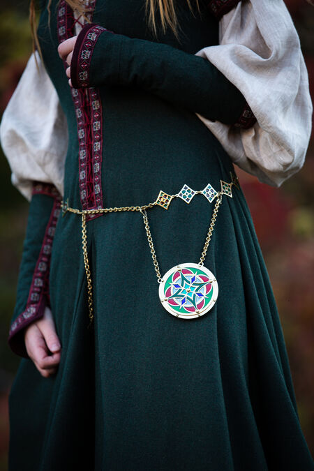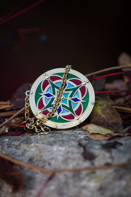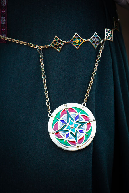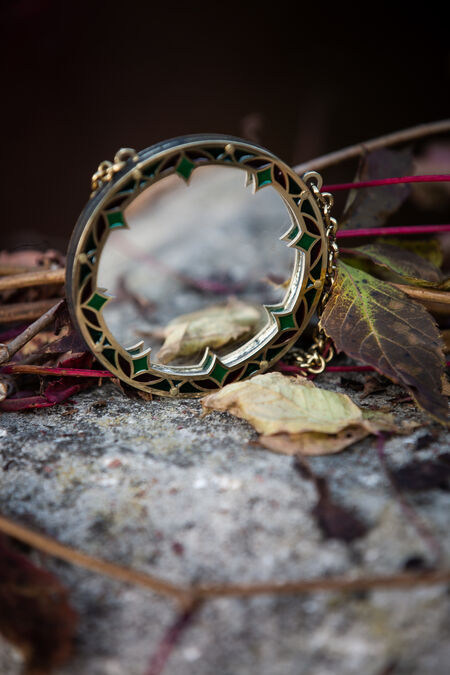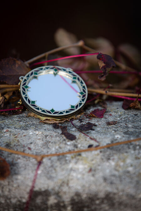 Der Spiegel besteht aus zwei Messingschichten und einer dazwischen liegenden Lederschicht. Der vordere Teil ist mit Emaille bedeckt. Blaue, grüne und rote Emaille bilden eine wunderbare Farbkombination, die der Hauptidee dieser Kollektion folgt, bei der wir Messing und Emaille kombinieren. Die Rückseite des Spiegels besteht aus zwei Messingschichten. Einer davon ist massiv und der andere ist geschlitzt. Es ist so gefertigt, dass die Emailfarben tiefer und satter wirken. Der Spiegel verfügt außerdem über eine Kette zur Befestigung am Gürtel.