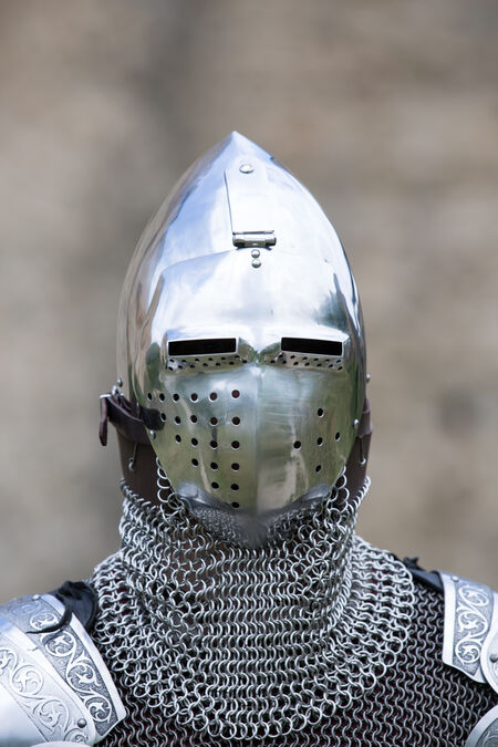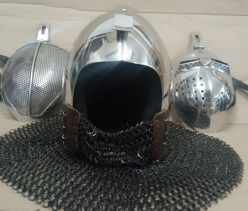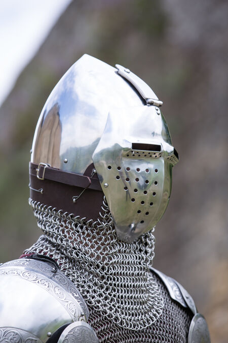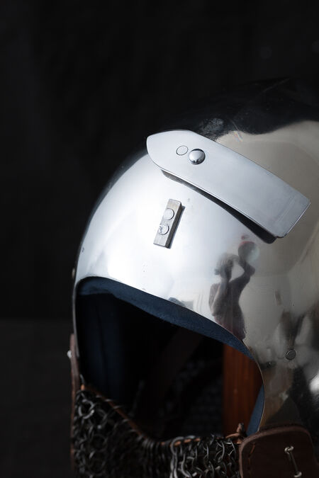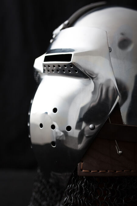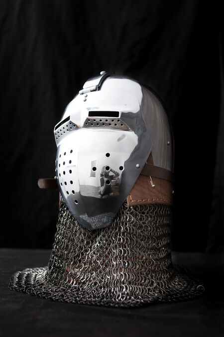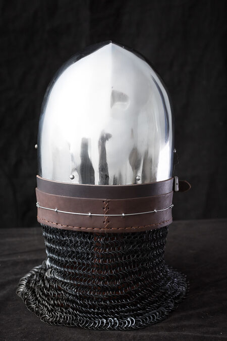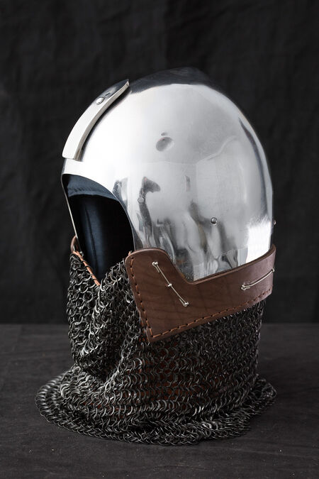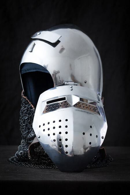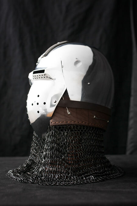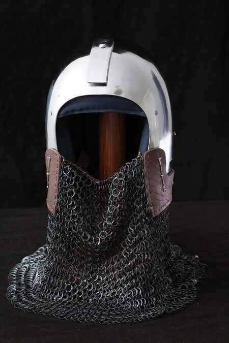 Dieser zuverlässige Helm ist eines unserer klassischen Designs und stark von historischen Quellen inspiriert. Diese schlichte, zuverlässige und unverwechselbare Beckenhaube ist eines der bedeutendsten Designstücke des Mittelalters. Es wurde von Waffenmännern, Freibauern und Rittern gleichermaßen verwendet, war ein unglaublich beliebter Stil und konnte mit einer Vielzahl unterschiedlicher Frontplatten verwendet werden. Ursprünglich aus einer Stahlkappe namens „Cervelliere“ entwickelt, wurden Bascinets zunächst offen unter größeren Helmen getragen. Eng anliegend und leicht, stellte sich bald heraus, dass die Bascinet ein ausgezeichneter Kampfhelm war. Bascinets mit Visier verbreiteten sich im späten 14. und frühen 15. Jhdt und wurden schnell als Haupthelm der Ritter im Hundertjährigen Krieg im gesamten Mittelalter bekannt. Bascinets, die nach oben gerichtet sind, um Pfeile und Lanzen abzuwehren, wurden sowohl mit offenem Gesicht als auch mit verschiedenen Visieren gefunden, aber für dieses Modell haben wir uns für ein Klappvisier entschieden. Dieses spezielle Modell ist von einem Fund aus Sitten aus dem Jahr 1370 inspiriert.