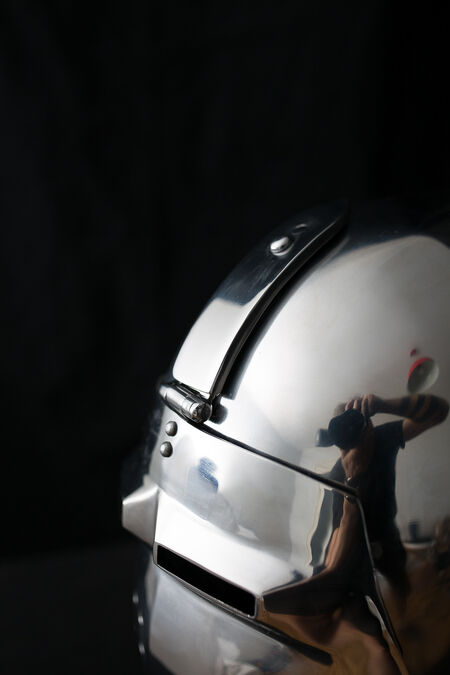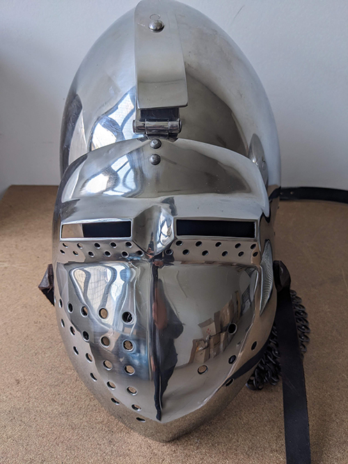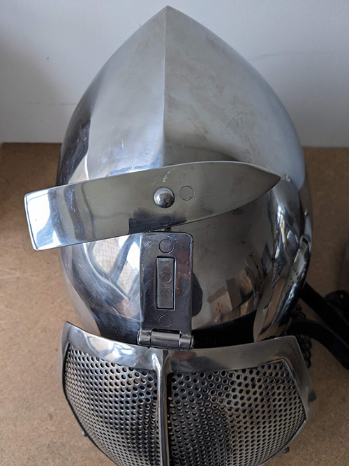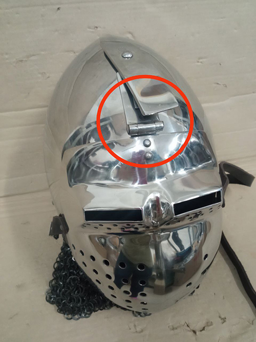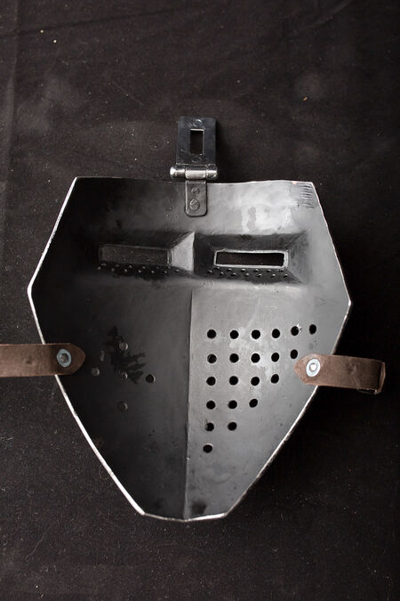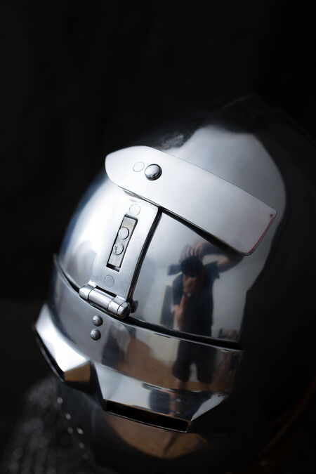 Klappvisiere wurden wegen ihrer einfachen Anbringung bevorzugt: Das Scharnier ermöglicht es, sie hochzuklappen, wenn man nicht im Kampf ist, und sie mit einem Lederriemen auf der Rückseite zu sichern, wenn sie heruntergeklappt sind. Außerdem haben sie ein niedriges Profil und ragen nicht so stark hervor wie beispielsweise die Schnauze des Hounskull-Visiers. Klappvisiere waren zwischen 1340 und 1370 in Deutschland und Norditalien typisch, daher nennen wir sie eine deutsche Bascinet. Wir haben den Scharniermechanismus des Visiers perfektioniert, um es einfach zu bewegen und gegen ein anderes Visier oder einen Bargrill auszutauschen.