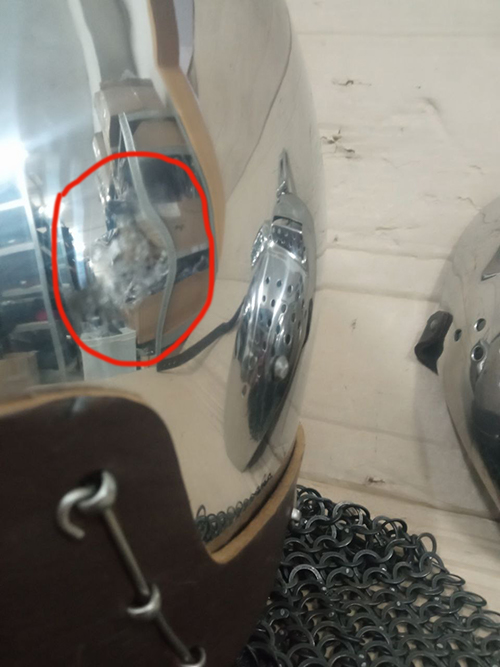 - Bitte beachten – Der Helm weist Mängel auf: Die Stange, die das Visier hält, ist lose befestigt. An den Seiten des Helms befinden sich Kratzer vom Visier. Wie auf den Fotos zu sehen ist;