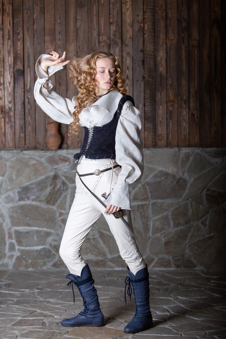 Natürliches Leder ist das Hauptmaterial, aus dem wir die Stiefel hergestellt haben. Es ist perfekt für diese Art von Design, weil es super stark ist, aber auch gut zum Leben passt. Das Design des Stiefels ist schön und einfach und zielt darauf ab, nicht auf extravagante Weise hervorzuheben, sondern den Rest Ihres Kostüms zu ergänzen und ein Teil davon zu sein. Die Form des Stiefels ist vorne mit einem schlanken, schmeichelhaften Profil abgerundet, das ihnen einen raffinierten, praktischen Look verleiht. Sie sind fast kniehoch und reichen bis zu Ihrer oberen Wade. Die Schnürung verläuft von der Knöchelbasis über die Fußspitze bis nach oben. Da sie sich mit Schnürung öffnen, können Sie Ihren Fuß in sie einpassen, haben aber immer noch einen taillierten Blick auf Ihre Beine. Die Zunge des Stiefels ist an einer Seite befestigt und kann auf der anderen Seite gespalten werden, was das Positionieren erleichtert (eine Zunge, die nicht mit den Seiten verbunden ist, lässt sich nur schwer an der richtigen Stelle positionieren und neigt dazu) unangenehm sein). Die Schlaufen für die Schnürung bestehen aus einem starken Stoff, der mit zwei Lagen Nähten am Leder befestigt ist, um die Haltbarkeit zu erhöhen. Dank der starken, extralangen Schnürung haben Sie die richtige Passform um Ihr Bein - es liegt an Ihnen, ob Sie die Schnürung kürzer schneiden möchten, sobald Sie die Stiefel besitzen, oder ob Sie sie wie ein „Strumpfband” zum Wickeln verwenden möchten um die Basis Ihres Knies und halten Sie die Stiefel hoch.