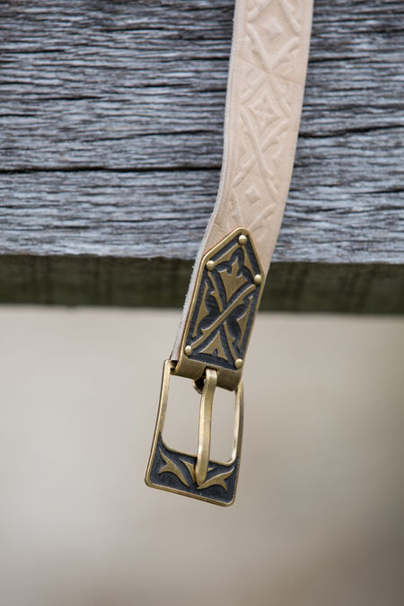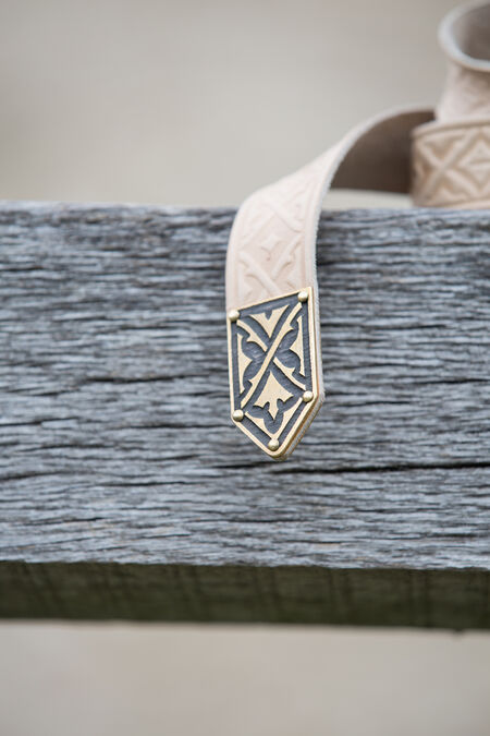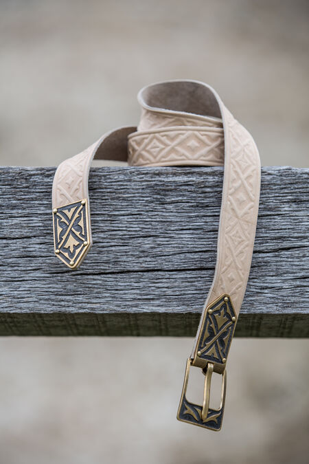 Der Gürtel „Der Königsmacher“ hat eine milchweiße Farbe, die den Adel widerspiegelt. Er nutzt einige unserer am meisten praktizierten Spezialitäten - Ätzen und Prägen. Der ganze Gürtel ist tief mit einem Muster geprägt, das an die Grenzen der europäischen Handschriften aus 14.-15. Jhdt erinnert und ihm einen vertrauten, aber dennoch zutiefst mittelalterlichen Look verleiht. Die Gürtelschnalle und Ortband sind in einem passenden Muster, das das Motiv fortsetzt, geätzt und werden mit schönen kleinen massiven Messingnieten am Gürtel gehalten.