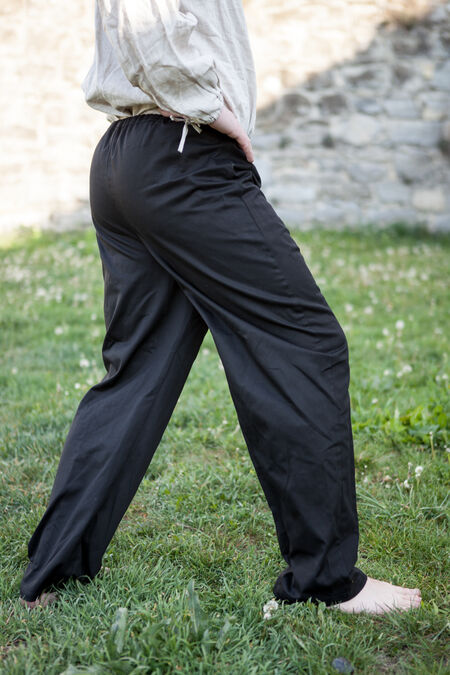 Schwarze Mittelalter Baumwollhose. Als erfahrene LARP-Spieler und Teilnehmer an historischen Veranstaltungen erinnern wir uns, wie schwierig es ist, einfache Hosen ohne all diese modernen Verschlüsse, Nieten und Stiche zu finden. Deshalb bieten wir einfache Baumwollhosen an, die nach dem klassischen Muster hergestellt wurden. Sie bestehen aus 100% natürlicher Baumwolle und können mit jeder Art von mittelalterlichen Schuhen oder Stiefeln getragen werden.