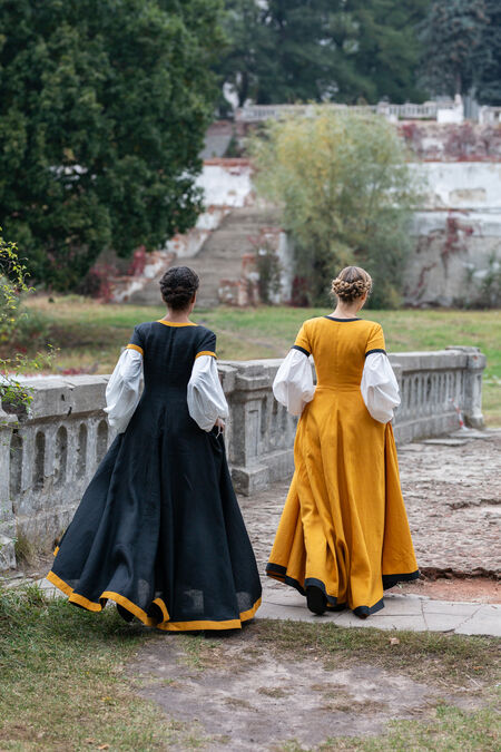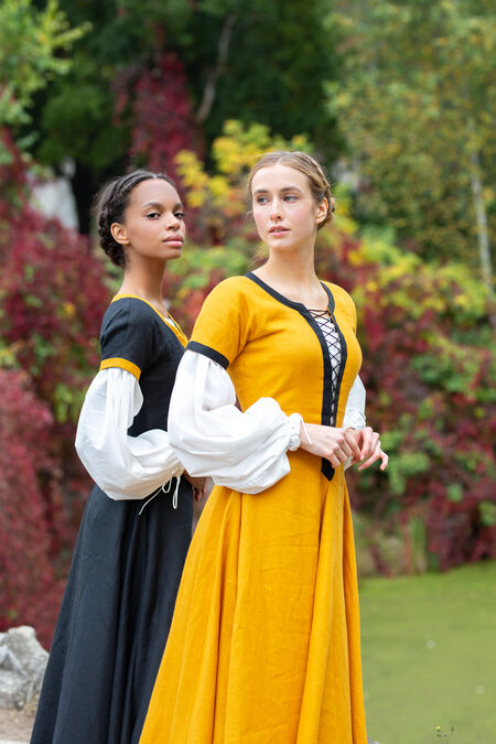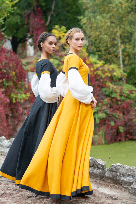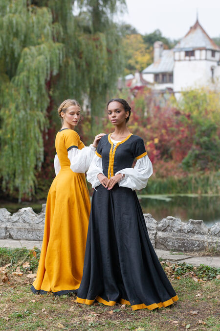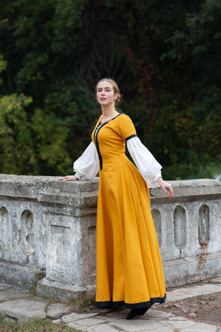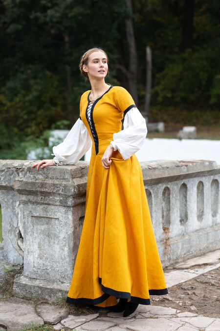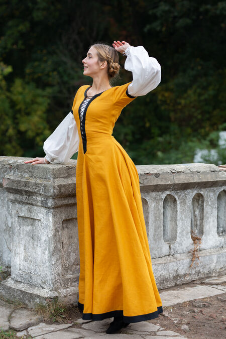Das Design dieses Kleides stammt ursprünglich aus den Wünschen unserer Kunden nach einem mittelalterlichen Kleid mit kurzen Ärmeln. Bei vielen Veranstaltungen bei heißem Wetter stellten die Leute fest, dass langärmelige Kleider etwas zu eng waren. Unsere Lösung war dieses wundervolle Kleid, das mittelalterlich aussieht, aber schöne kurze Ärmel hat, die Sie je nach Komfort mit bloßen Armen tragen oder mit einem leichten Hemd kombinieren können. Es gibt keine spezifische historische Inspiration, aber der Stil kann mit dem Cotehardie der Frauen und anderen Beispielen für eng anliegende Kleider aus dem XIV-XV Jhdt verglichen werden.