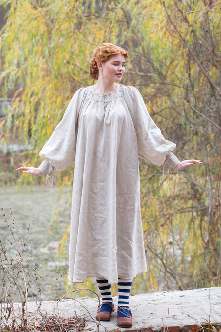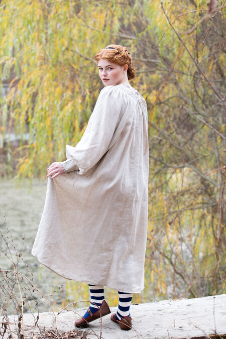 Inspiriert von Silhouetten aus dem XVI. Jahrhundert, fällt dieses Kleid locker und bequem aus. Wir haben uns von historischen Quellen von Frauen in Badehäusern inspirieren lassen, die uns einen Einblick in die Unterwäsche des Mittelalters geben. Es fließt bis knapp unter die Knie, was bedeutet, dass es nicht stört, wenn Sie knien oder rennen müssen. Im Nacken ist der gesamte wogende Stoff in einer Reihe von sehr hübschen kleinen Falten zusammengefasst und organisiert, die perfekt flach sitzen, wobei zwei Leinenbandlinien oben und unten in der Mitte Bindebänder bilden. Obwohl diese Falten perfekt funktionell sind, sehen sie nur deshalb dekorativ aus, weil sie meisterhaft genäht wurden!
