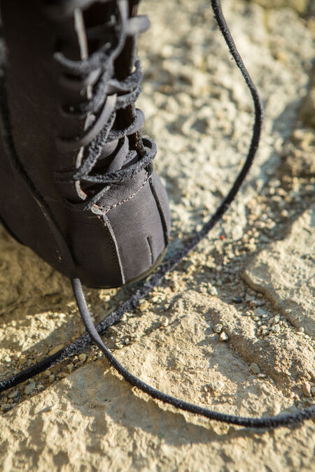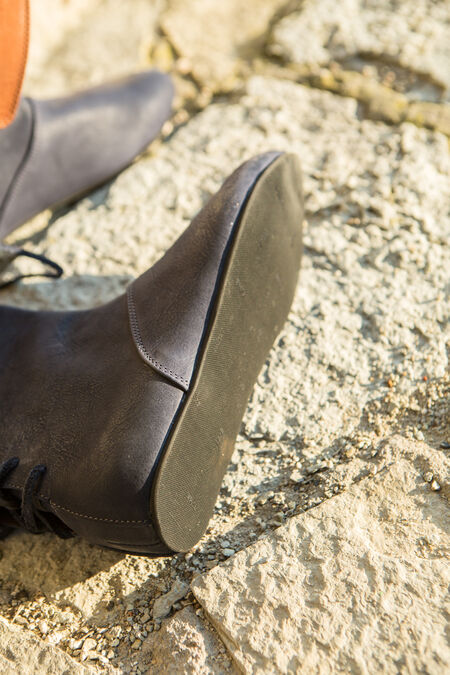 Diese Stiefel haben moderne Sohlen, die einen sicheren Halt gewährleisten und sich perfekt für verschiedene Arten von Aktivitäten eignen - vom üblichen Gehen über Tanzen bis hin zu mittelalterlichen Kämpfen. Sie bestehen aus mehreren Schichten: Ledereinlegesohle, Lederfaserplatte, poröse, atmungsaktive orthopädische Basis und gerippte Gummilaufsohle. Dieses Modell kann nicht mit authentischen Sohlen hergestellt werden, aber in unserem Geschäft finden Sie viele andere historisch genaue Modelle mit Ledersohlen.