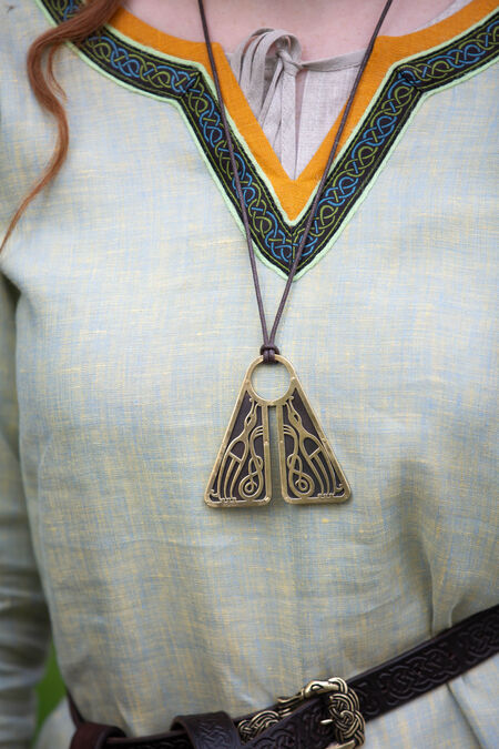 Diese Kette ist Teil eines aufregenden Updates unserer Kollektion „Schildmaid”! Diese Kollektion besteht aus Kleidern, Schürzen, Kaftanen und vielem mehr und enthält einige unserer meistverkauften Wikinger-Kleidungsstücke. In dieser Kette finden Sie vertraute Designs und Figuren, die auch in der restlichen Kollektion zu finden sind. Sie passt also gut, wenn Sie bereits ein Oberteil oder ein Kleid besitzen. Allerdings wird diese Halskette aus Messing mit jeder Art von Wikinger-Kostüm und wahrscheinlich auch mit Ihrer Alltagskleidung fantastisch aussehen, wenn Sie ein bisschen abenteuerlustig sind.