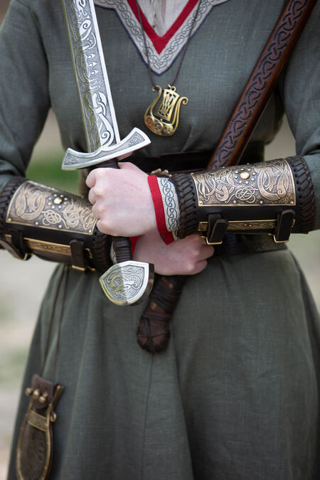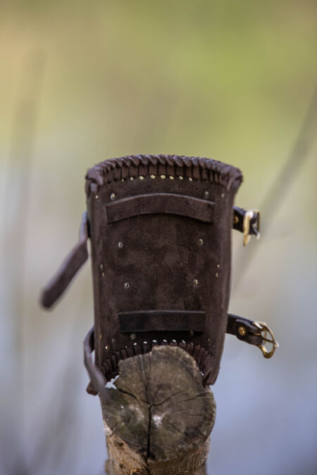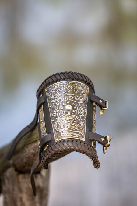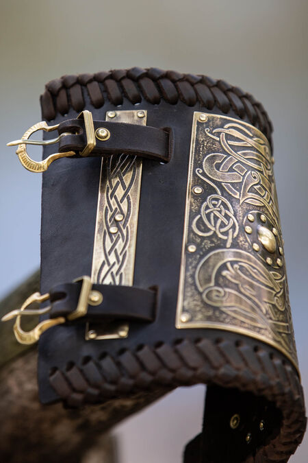 Die Armschienen werden mit Hilfe von zwei Riemen geschlossen, die mit Wikingerschnallen aus Messingguss verziert sind. Es handelt sich um kurze Armschienen, die sich etwa auf halber Höhe Ihres Unterarms befinden, sodass sie Sie nicht zu sehr belasten oder Ihren Kampf mit ihrer Masse beeinträchtigen. Wir wollten, dass diese leicht, bequem und dennoch schützend sind.