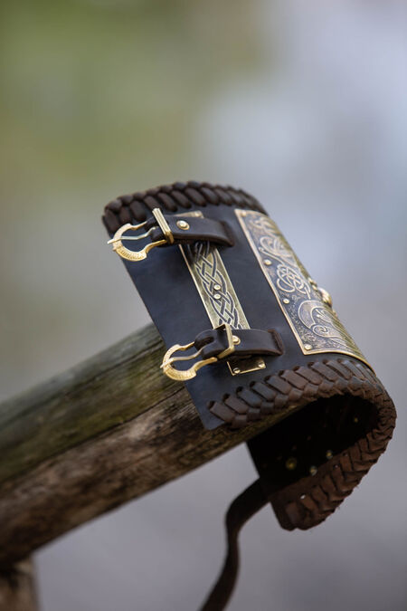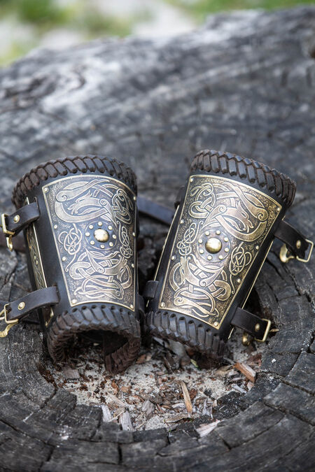 Diese Armschienen sind aus echtem Leder gefertigt und mit Akzenten aus Messing verstärkt, um ihnen zusätzliches Gewicht zu verleihen. Das Messing ist mit unserem neuen Wolfsmuster verziert, zusammen mit Wikinger Knotenmustern, die sie wirklich zu einem visuellen Vergnügen machen. Die Platten sind mit kleinen Messingnieten befestigt, die zum Gesamtbild beitragen. Die Außenseite der Armschiene ist mit einem Lederriemen versehen, der auf die Kante gestickt wurde.
