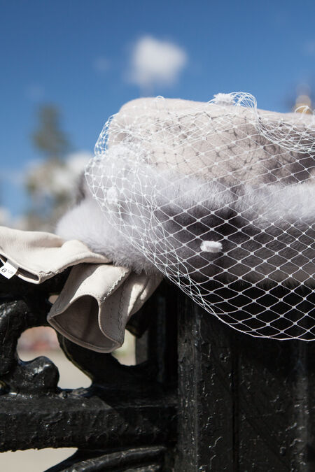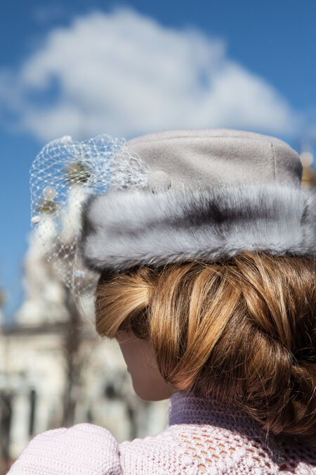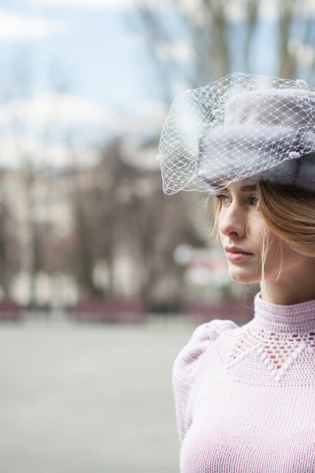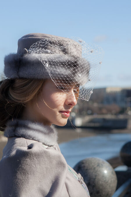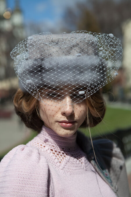 Dies ist eine Art von einem kleinen runden Hut aus natürlicher Wolle gefaltet in Form ohne Krempe. Es hat ein Fell als das Band und ist mit einem gemusterten Jacquard-Futter von der Unterseite verziert. Es hat einen zarten weißen Schleier, um die Augen zu decken. Es ist mit kleinen Punkten und mit einem Paar von Wolle-bezogenen Knöpfen an den Seiten verziert.