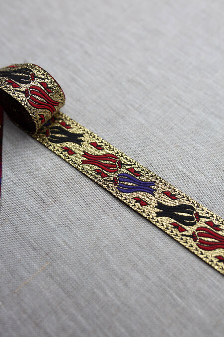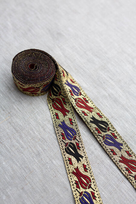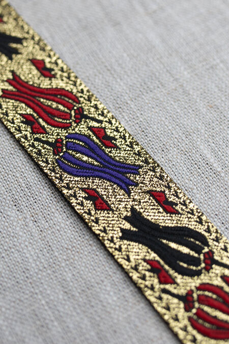 Diese Borte mit kontrastierendem Blumenmuster passt perfekt zu vielen verschiedenen Persönlichkeiten und verleiht Ihrem mittelalterlichen DIY-Projekt dank des leuchtend goldenen Hintergrunds und der roten, blauen und schwarzen Tulpen darüber einen auffälligen Akzent. Sehen Sie sich nur diese Farben an!