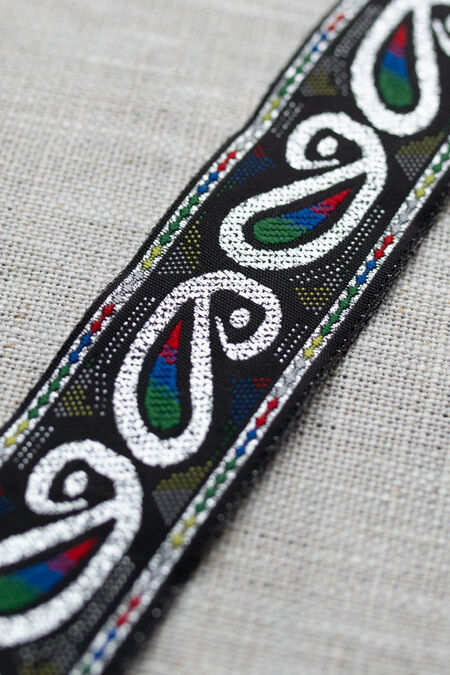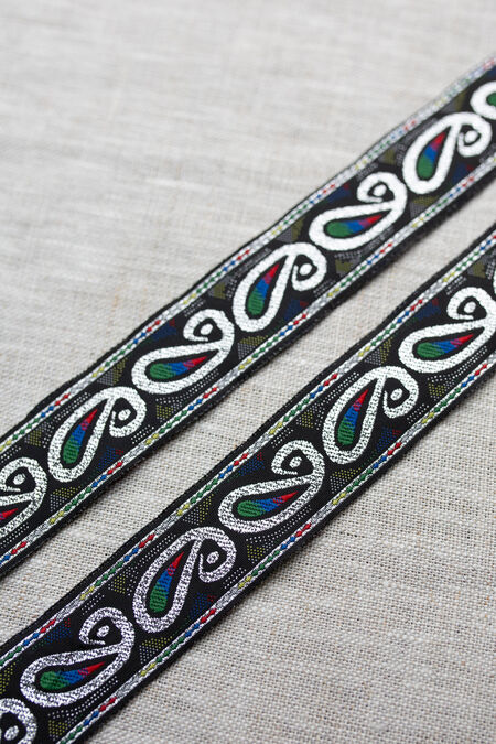Diese schmale Borte besticht durch silberne Paisley-Ornamente in Grün, Blau und Rot auf schwarzem Hintergrund – ein kontrastreiches und ungewöhnliches Farbschema, das auf traditionelle Muster übertragen wurde und sich vielseitig für verschiedene mittelalterliche Kostümprojekte eignet.