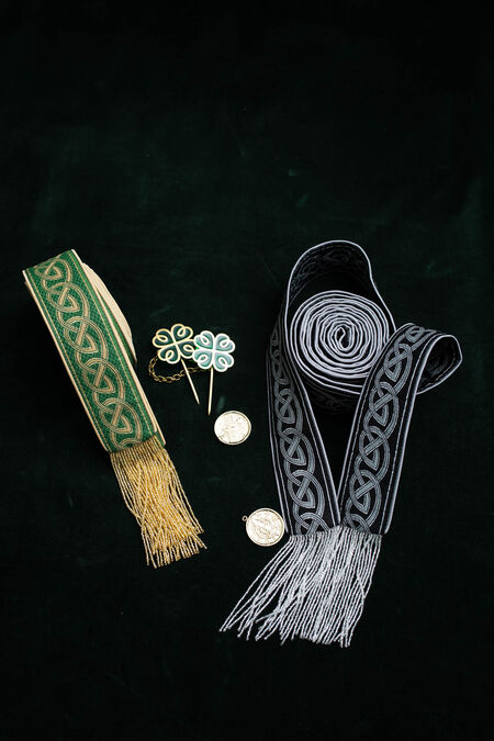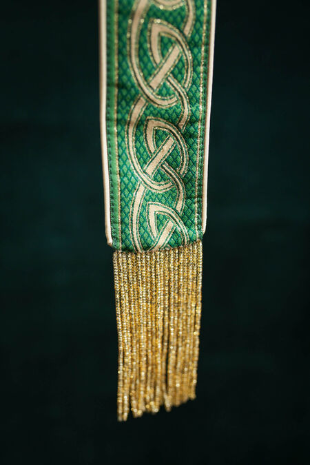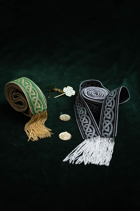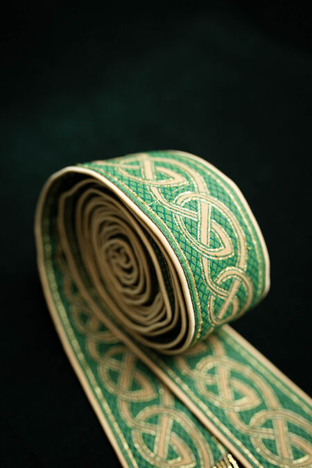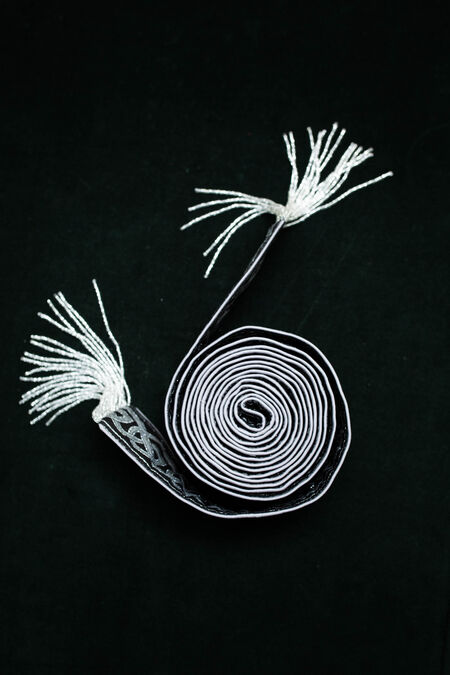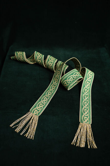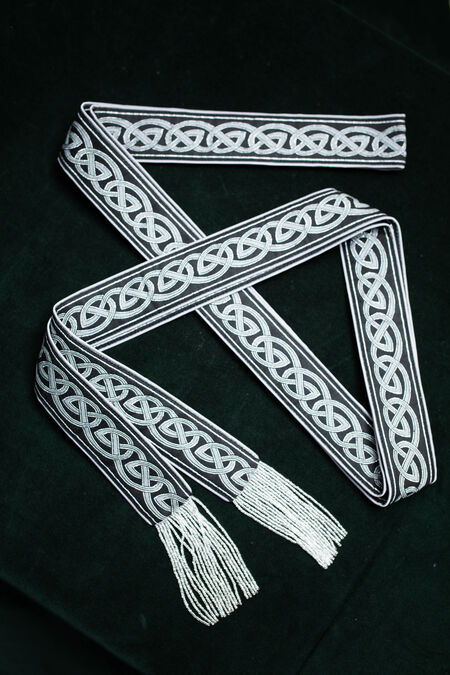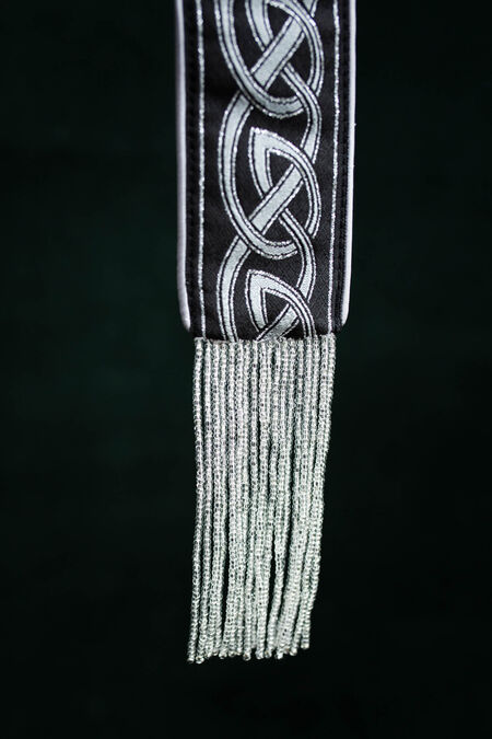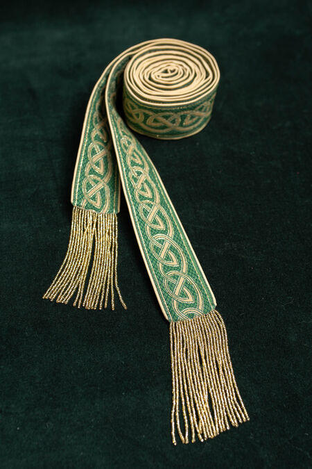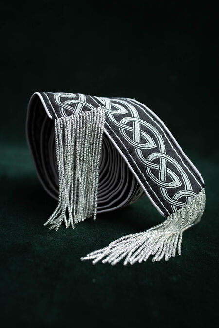 Dieses Modell ist besonders schick, breit (5 cm) und lang. Er ist beidseitig mit einer Borte verziert, was ihn sehr vielseitig macht, und verfügt über tolle Details wie Perlenfransen und eine Kordelverzierung am Rand, die die Kanten voluminöser wirken lässt und Stil und Qualität unterstreicht. Insgesamt ein perfekt universeller Gürtel, der als raffiniertes Accessoire dient und Ihrem Outfit Tiefe verleiht.
