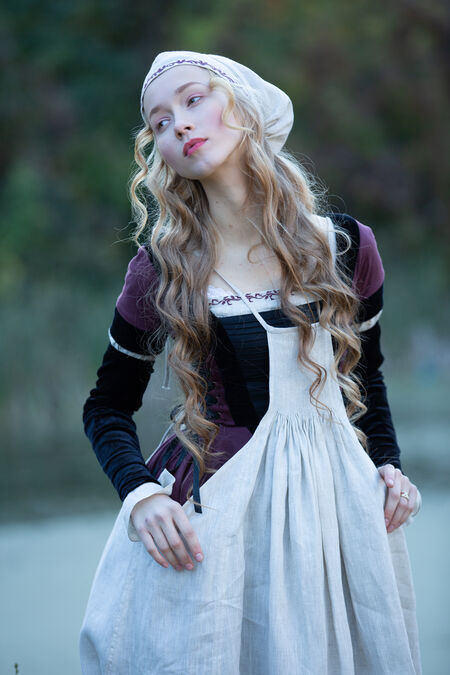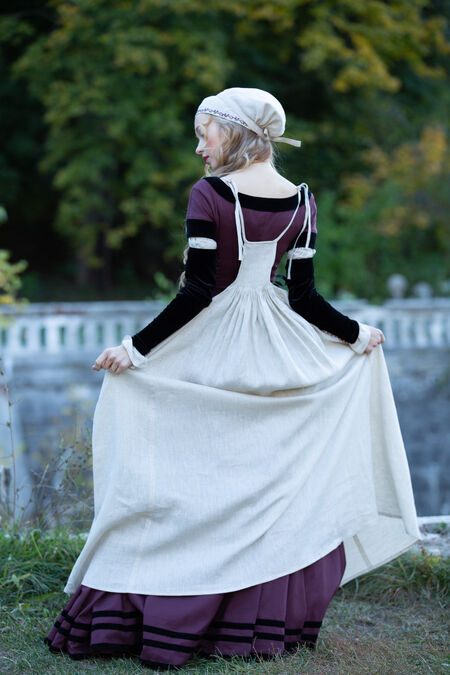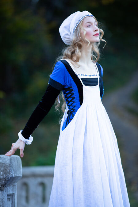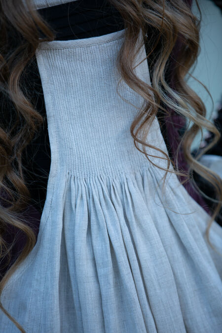 Diese Schürze passt zu Renaissance-Kostümen für Frauen verschiedener Rollen, darunter Bäuerinnen, Hebammen und Marktfrauen. Als äußere Schicht getragen, schützt die Schürze das Kleid vor Schmutz und Abnutzung, ohne es vollständig zu verdecken – der Saum, der Ausschnitt und die seitliche Schnürung des Mittelteils dieses Renaissance-Outfits bleiben sichtbar. Im Gegensatz zu modernen Schürzen bedeckt sie Vorder- und Rückseite und verfügt über verstellbare Schulterträger für einen bequemen Sitz. Die Schürze ist voluminös – 1,5 Meter Stoff sind im Brustbereich in winzige, 2 mm breite Falten gelegt, wodurch ein Saum von etwa 4 Metern entsteht. Gefertigt aus feinem Leinen, ist sie äußerst praktisch und bietet volle Bewegungsfreiheit.
