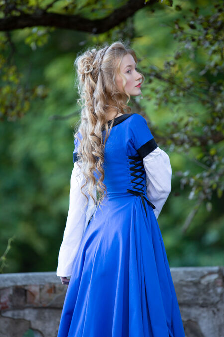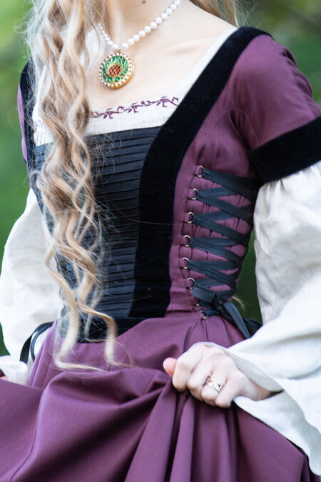 Die unverkennbar feminine Silhouette dieses Baumwollkleides ist von den Renaissance-Kostümen des späten 15. und 16. Jhdt inspiriert. Das taillierte Oberteil mit eckigem Ausschnitt, seitlicher Schnürung und taillierten Ärmeln harmoniert perfekt mit dem fließenden Rock. Die Samtapplikationen an den Kanten verleihen dem Kleid eine besondere Note. Das Vorderteil ist mit horizontalen Falten versehen, die die für Kleider dieser Epoche typische Schnürung imitieren. Die seitliche Schnürung sorgt jedoch dafür, dass auch Frauen mit modernen Figuren jeder Größe darin umwerfend aussehen. Das Hauptteil des Kleides hat kurze Ärmel, die am Oberarm enden. Die abnehmbaren, schwarzen Samtärmel lassen sich jedoch mühelos in ein langärmeliges Kleid verwandeln. Bitte beachten Sie, dass diese Ärmel nicht gebunden werden und keine Schnürung haben.
