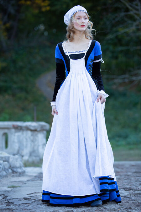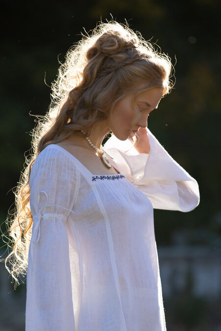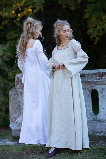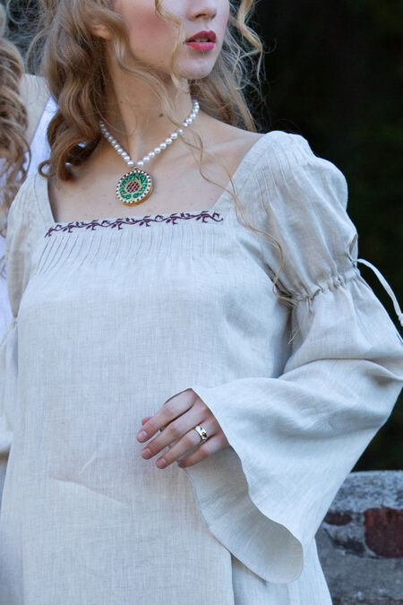 Dieses Hemd wurde traditionell unter dem Überkleid getragen, um es vor Abnutzung und Schweiß zu schützen und gleichzeitig Renaissance-Kostümen Volumen und Authentizität zu verleihen. Es ist aus feinem, weichem Leinen gefertigt und zeichnet sich durch Glockenärmel mit Leinenkordelzügen, kleine Falten an den Schultern und einen eckigen Ausschnitt aus. Inspiriert von der Anmut und Schönheit der Kleidung adliger Frauen, besitzt es zusätzliche Keile, die einen voluminösen Rock erzeugen. Das zarte, handgestickte Blattmuster am Ausschnitt verleiht ihm eine subtile, aber luxuriöse Note.