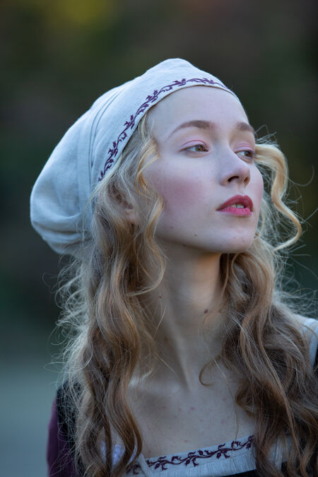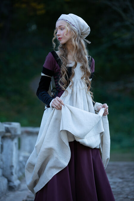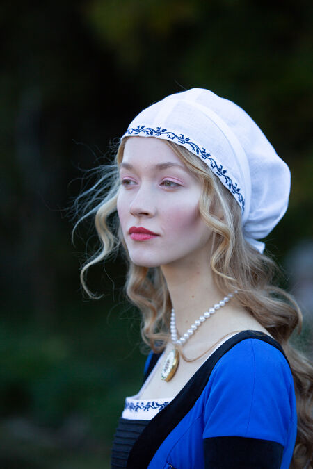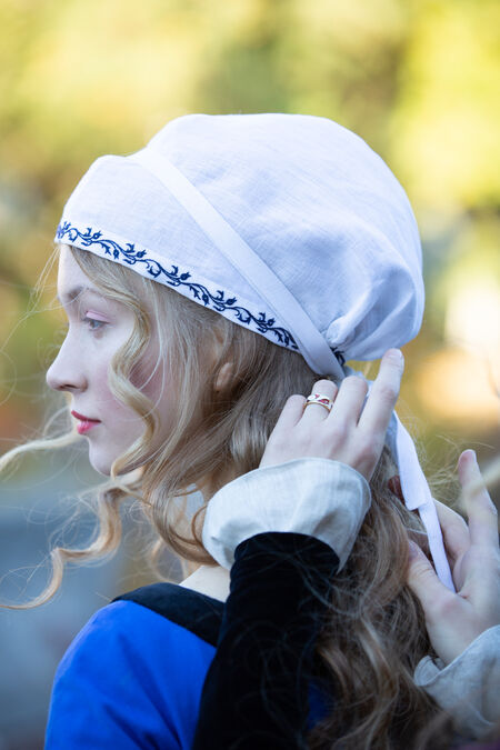 Diese historisch inspirierte Haube ist der St.-Brigitta-Kappe nachempfunden, die in der Maciejowski-Bibel (13. Jhdt) abgebildet ist. Die Kappe besteht aus feinem Leinen, hat eine Mittelnaht und einen voluminösen Hinterkopf. Sie bietet ausreichend Platz für alle Haare, egal wie lang Ihre Zöpfe sind, und wird mithilfe zweier langer Kordelzüge sicher fixiert. Ein wunderschönes, handgesticktes Ornament am Haaransatz harmoniert mit dem am Halsausschnitt des Hemdes. Sie können die Kappe solo oder unter Hüten tragen. Sie passt zu einer Vielzahl mittelalterlicher Charaktere, vom Bauern bis zur Adligen.
