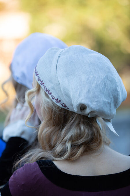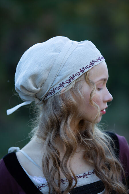 - Feine Leinenhaube im Stil der Heiligen Brigitta mit Handstickerei.