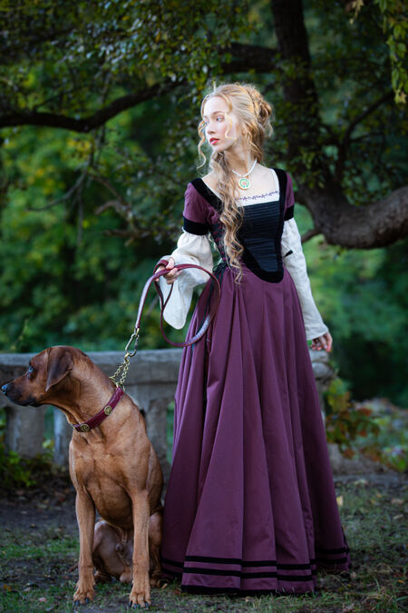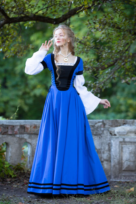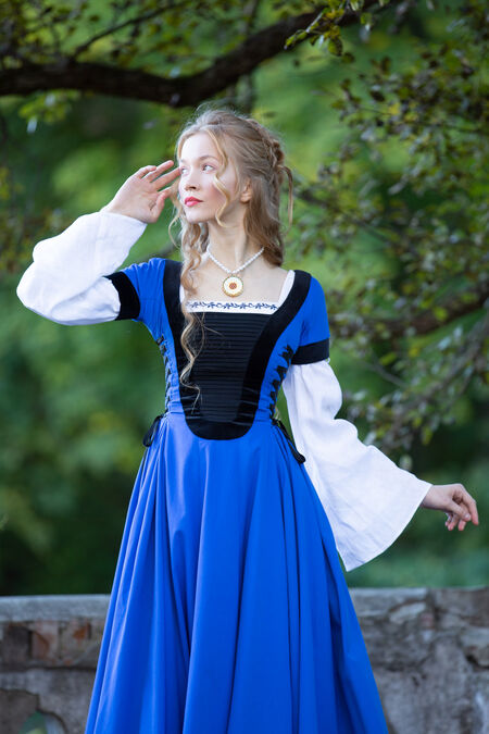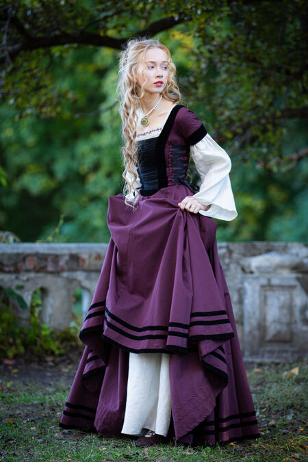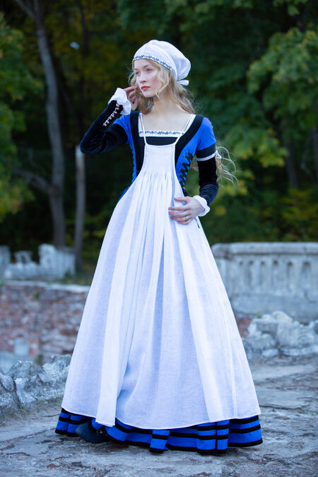 Dank der zahlreichen erhaltenen Gemälde aus dem 15. und 16. Jhdt, die verschiedene Szenen und Bevölkerungsschichten zeigen, können wir detailliert nachvollziehen, was die Renaissance-Kleidung der Frauen damals auszeichnete. Renaissance-Kleidung war durch Oberflächenverzierungen wie Stickereien und kontrastierende Stoffkombinationen gekennzeichnet und bestand oft aus einem eng anliegenden Oberteil mit abnehmbaren Ärmeln und einem weiten Rock. Sie wurde üblicherweise über einem feinen Unterkleid getragen und durch weitere Lagen ergänzt. Die Kopfbedeckung war ein wesentlicher Bestandteil des Erscheinungsbildes und spiegelte, ähnlich wie das Hauptkleid, die genaue Epoche und die Region Europas wider, aus der ihre Trägerin stammte. Diese Zeit war geprägt von kurzlebiger und schnell wechselnder Mode und der Sorge, „nicht mehr zeitgemäß“ zu sein.