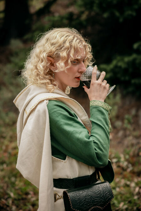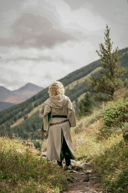 Dieser ist kein gewöhnlicher Wappenrock. Er ist aus hochwertiger italienischer Wolle gefertigt, weich und fließend, und hat abnehmbare Ärmel. Diese können Sie einfach als normale Ärmel tragen oder wie Flügel über den Schultern hängen lassen, wenn Sie Ihre Arme frei und uneingeschränkt haben möchten. Ähnlich wie unsere mittelalterliche Tunika „Hohle Hügel“ verfügt sie über Reitschlitze vorne und hinten, die das Laufen und Gehen zusätzlich erleichtern. Das Kleidungsstück ist mit kontrastierenden goldenen Nähten entlang der Mittel- und Armschlitze verziert. Der tiefe Ausschnitt macht ihn als Oberbekleidung bequemer.