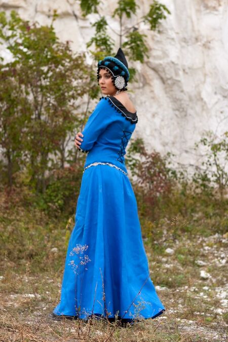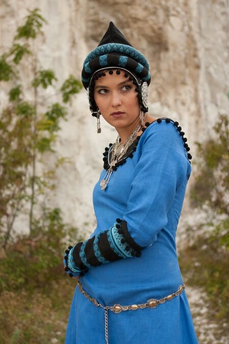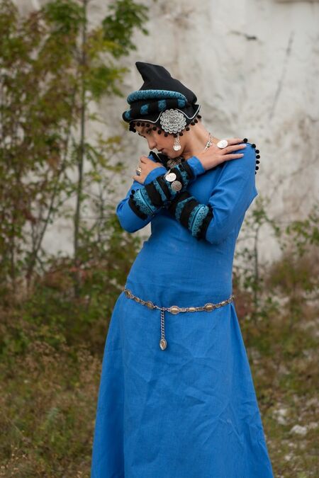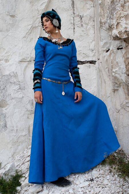 Das Kleid: Es wird sehr sorgfältig aus 100% Leinen hergestellt. Das Kleid ist am Rücken geschnürt. Dekolletee und Saum sind mit Borten umgenäht. Die Bracers für Arme sind aus einem gemusterten Stoff hergestellt und sind abnehmbar.