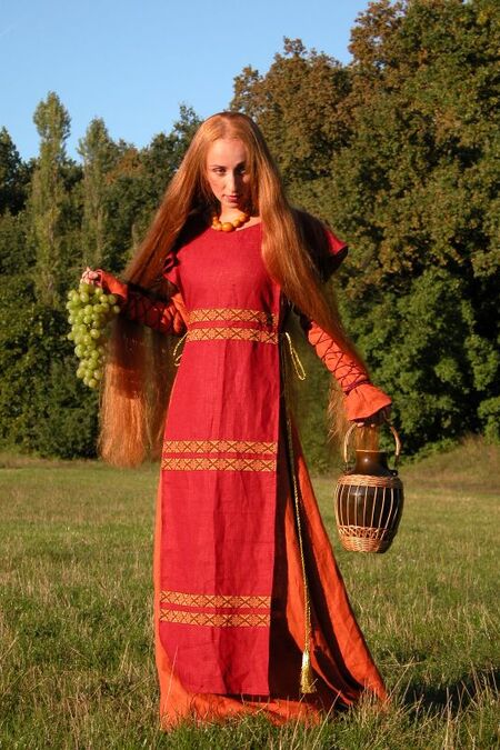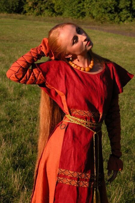 2. Überkleid, Surcoat: 100 % Leinen, verziert mit wunderschönen Bordüren. Die goldene Schnürung an den Seiten ist wahlweise auch als Gürtel zu nutzen.