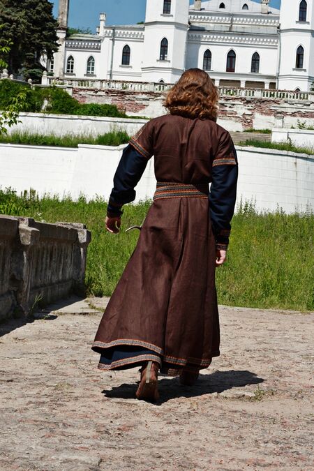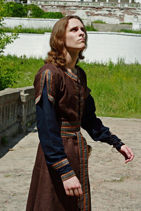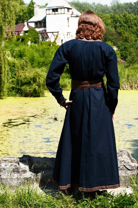 Dieses Cotte aus 100% Leinen entspricht in Stil und Design der Mode mittelalterlichem Kostüm des XIII Jahrhundert in Westeuropa. Sie können aus Schwarzen, Braunen, Natürlichen oder Blauen Leinen auswählen.