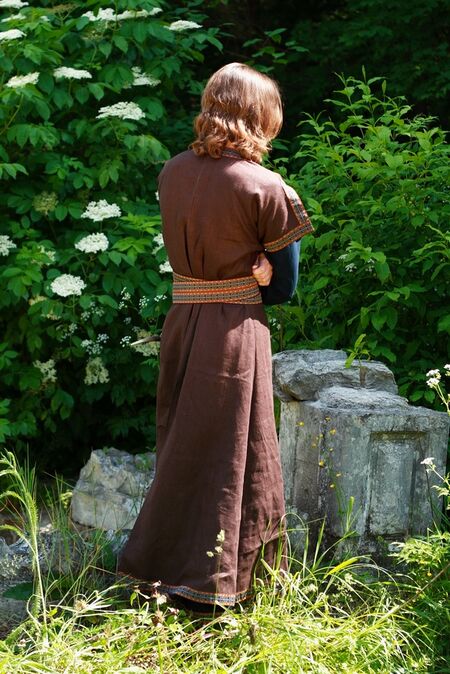 Dieses Gewand wird aus Baumwolle und Leinen gefertigt, der Gürtel wird aus derselben Borte gemacht wie das ganze Gewand, also kein Leder dort.